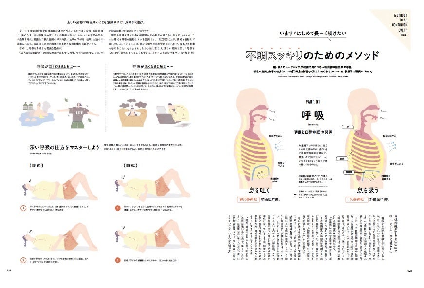 細く長く続けるトータルケアが改善の道につながる自律神経由来の不調。呼吸や姿勢、食事の仕方は、実は「自律神経」と密接な関係にある。これらを整えることで、“何となく不調”から脱することが可能に。日常に無理なく取り入れられる呼吸法や姿勢リセット、食生活の改善方法をたっぷり指南。これらのメソッドを積極的に習慣づけてパワフルに過ごそう!