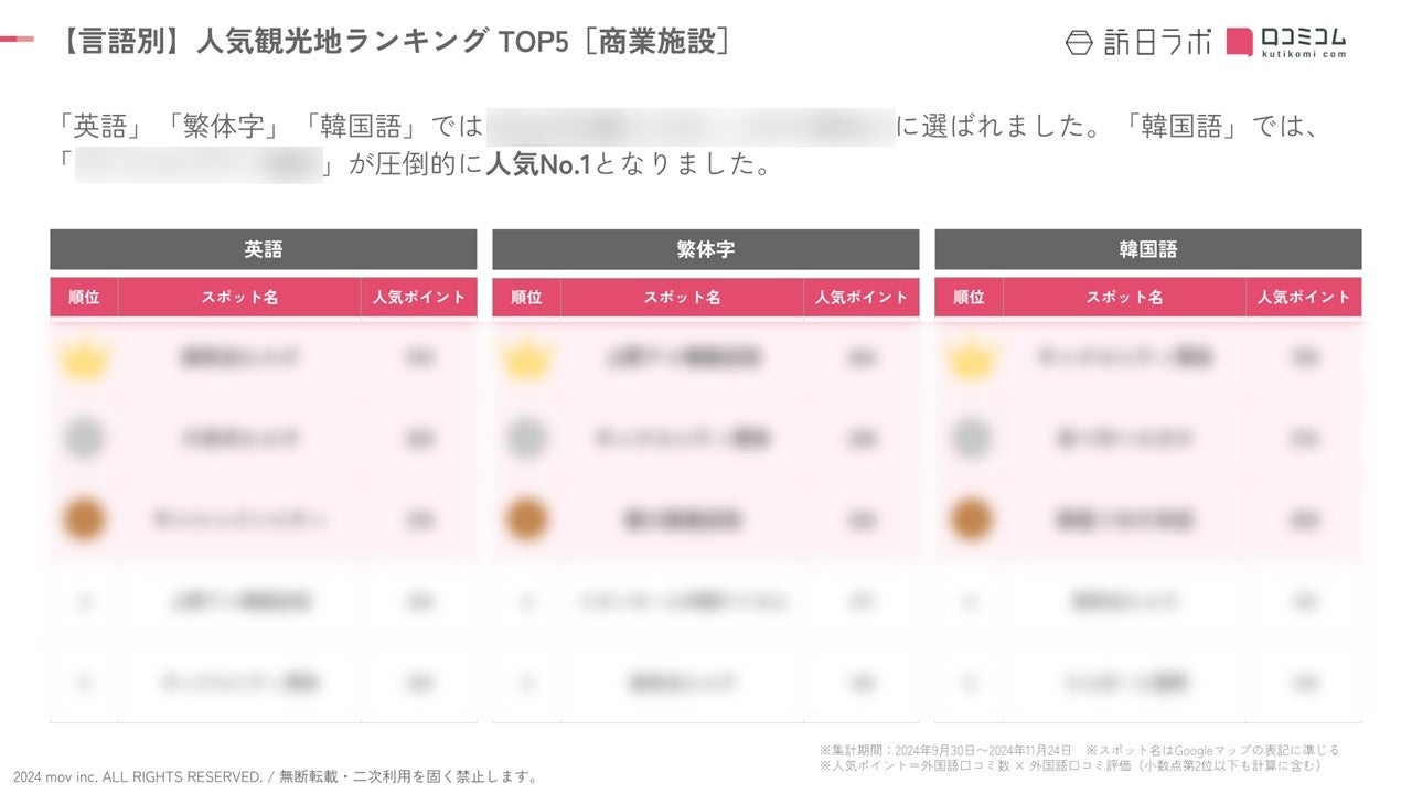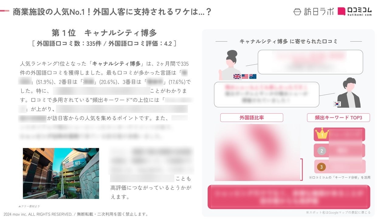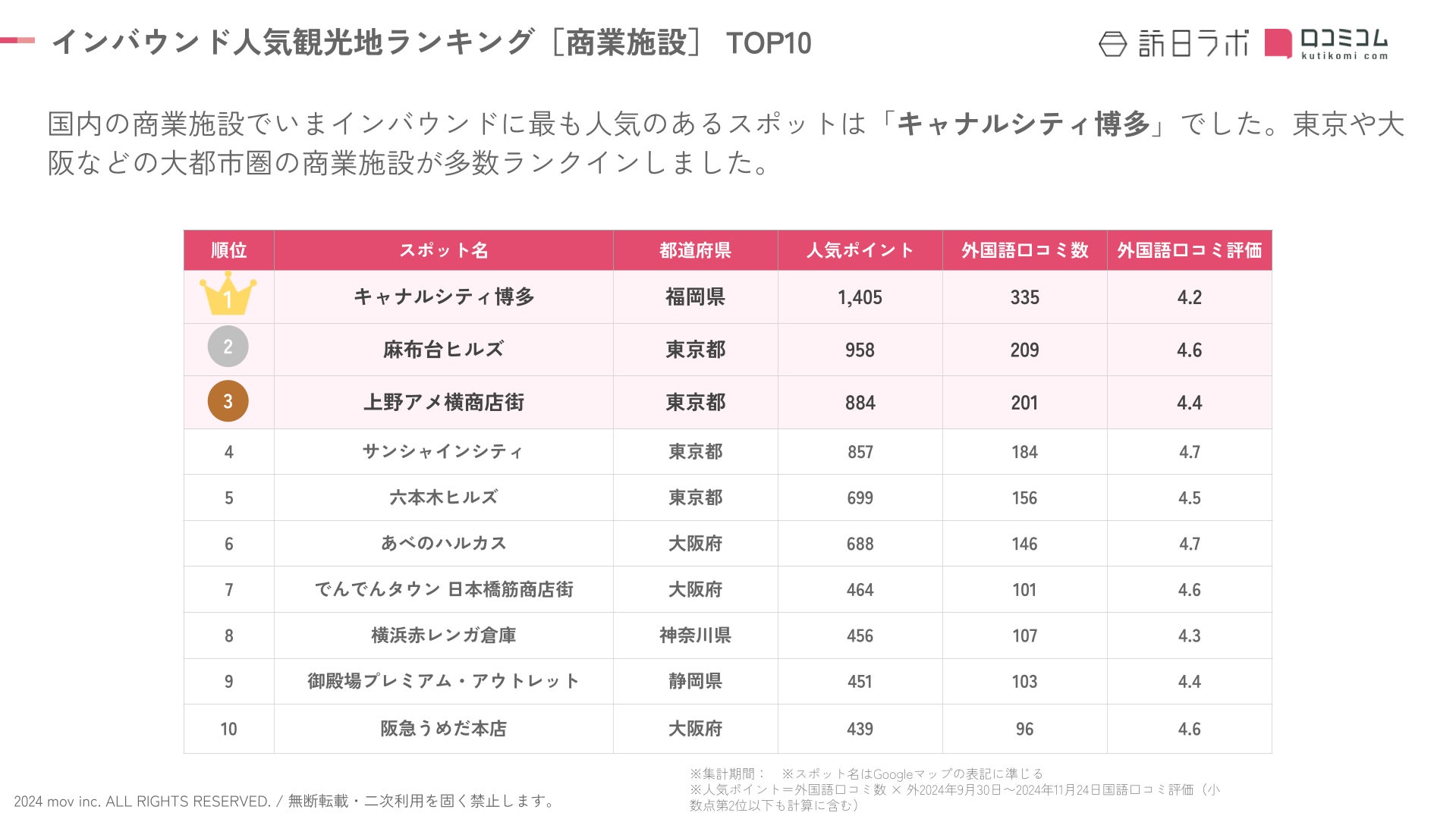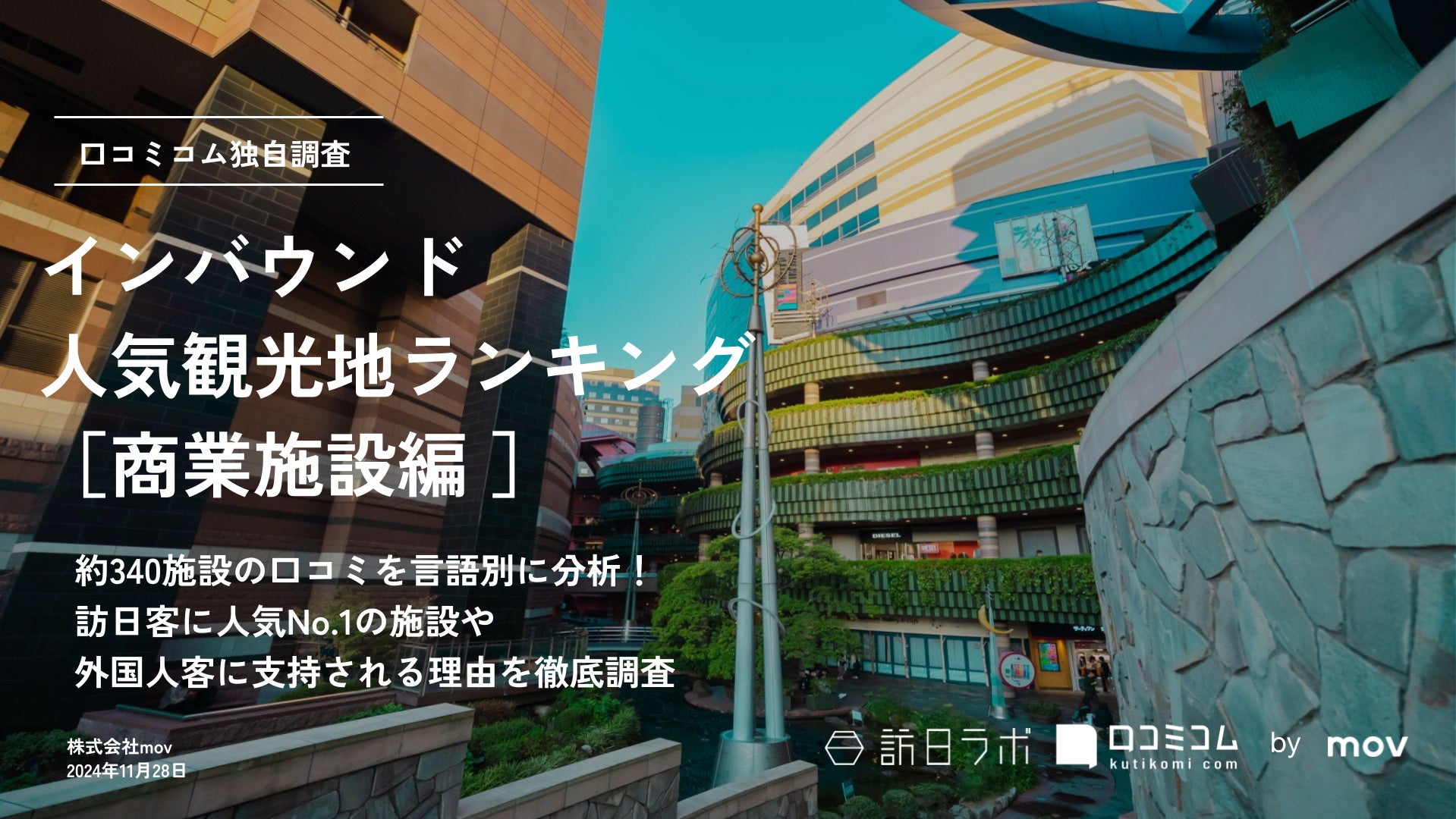 業界最大級のインバウンドビジネスメディア「訪日ラボ」及び 店舗向け集客一元化プラットフォーム「口コミコム」を運営する株式会社mov(代表取締役:渡邊 誠、本社:東京都渋谷区、以下mov)は、国内商業施設に寄せられた最新の口コミデータから、独自の『インバウンド人気観光地ランキング』を発表しました。