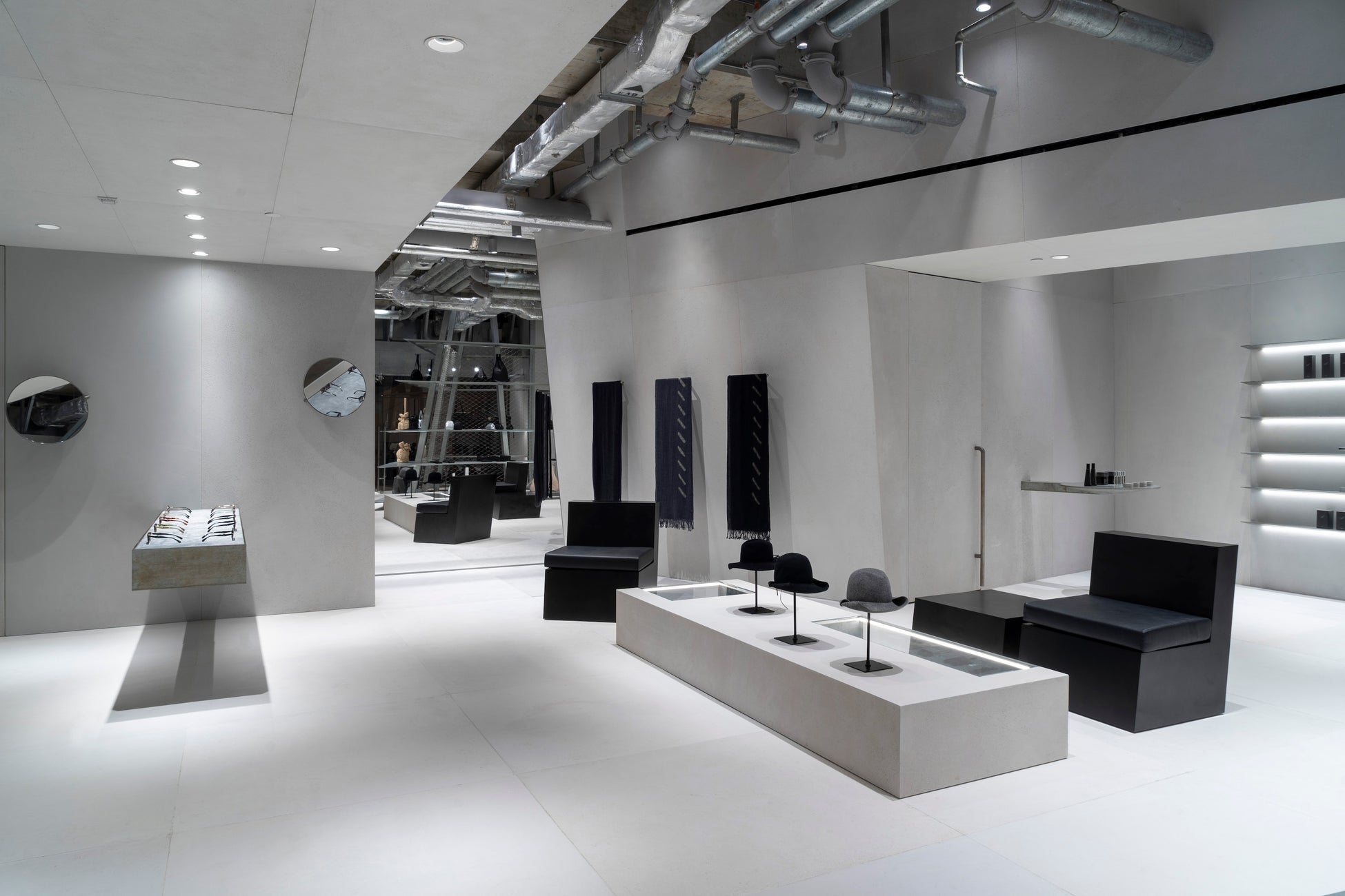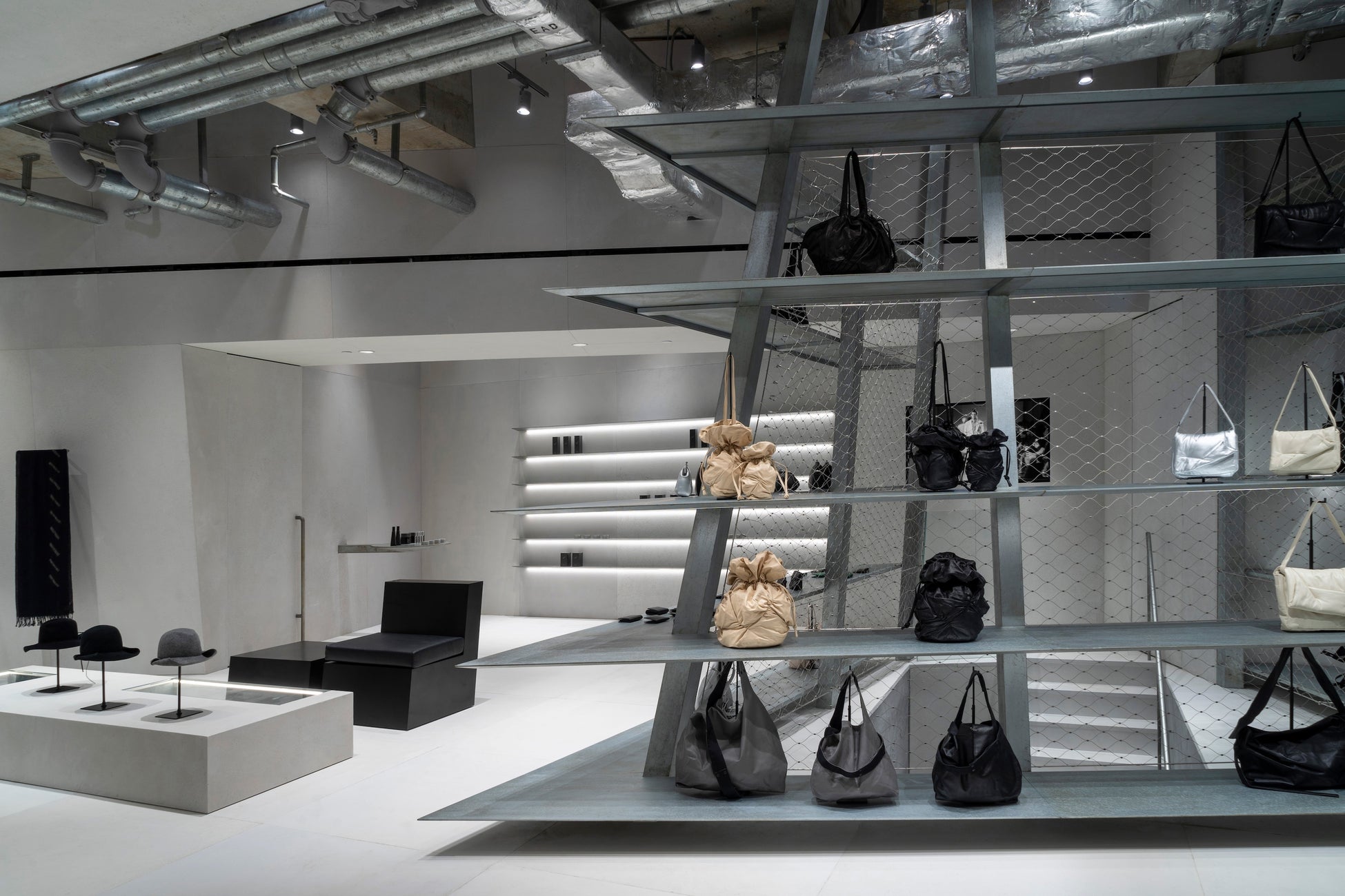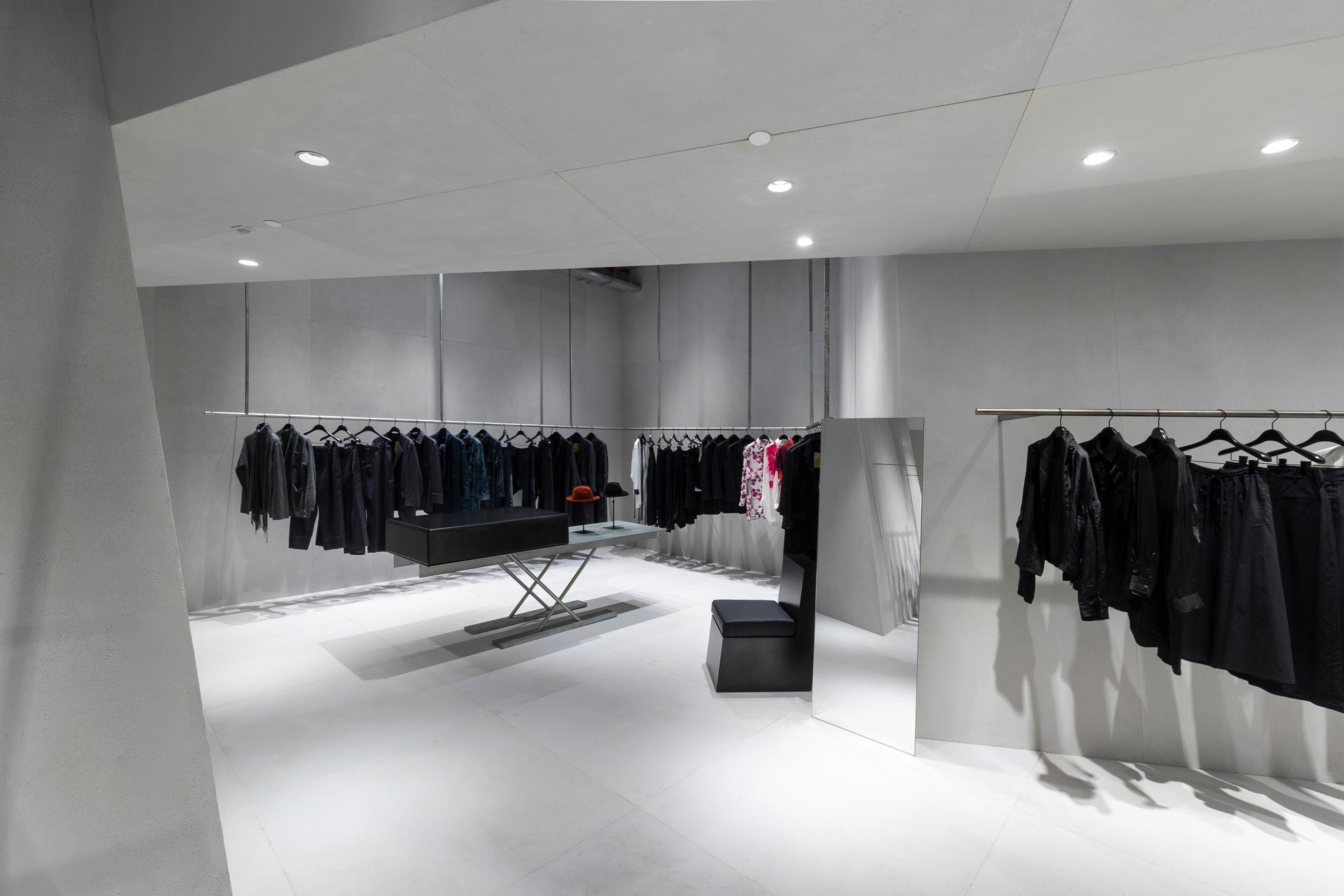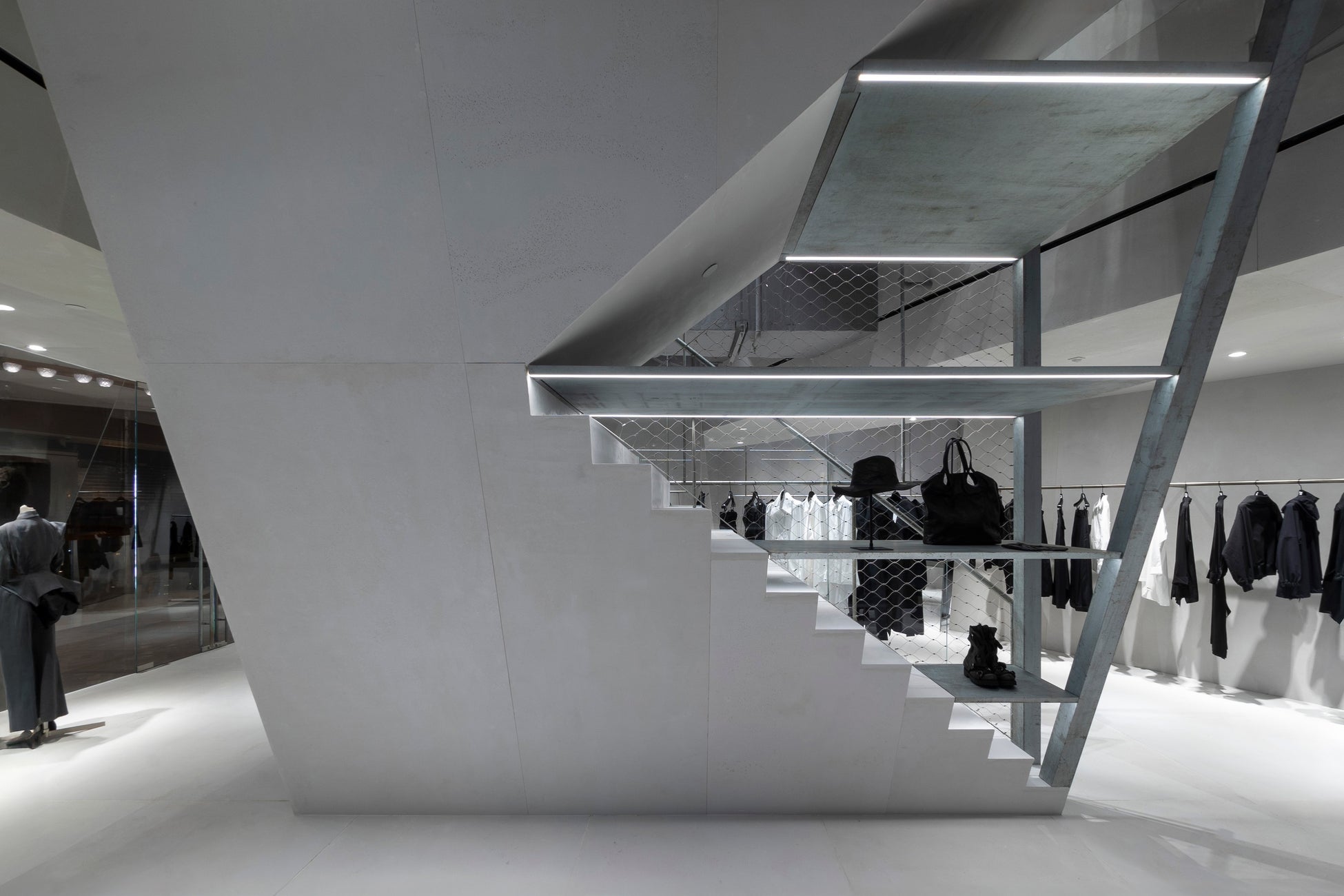 デュプレックスの店舗の1階はコレクションを展示するラックが並び、サロン風の2階部分には、バッグ、アイウェア、アクセサリーなどの商品が展示されています。フロア同士を結ぶ階段は、2つのフロアを斜めに貫くスチールワイヤーと棚で覆われており、構成主義的な美的感覚が表現されています。全ての壁がわずかに斜めに傾斜しており、Yohji Yamamotoを象徴する非対称性と緊張感を表現しています。
