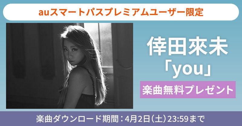 「auスマートパスプレミアム」は、エンタメ体験やショッピング割引など、 「おトク」な生活を提供する全てのスマホに対応した月額サービス。この度、auスマートパスプレミアムでは、 2022年3月3日(木)10時から会員限定・1カ月の期間限定で、倖田來未の人気楽曲「you」を無料ダウンロードプレゼントいたします。