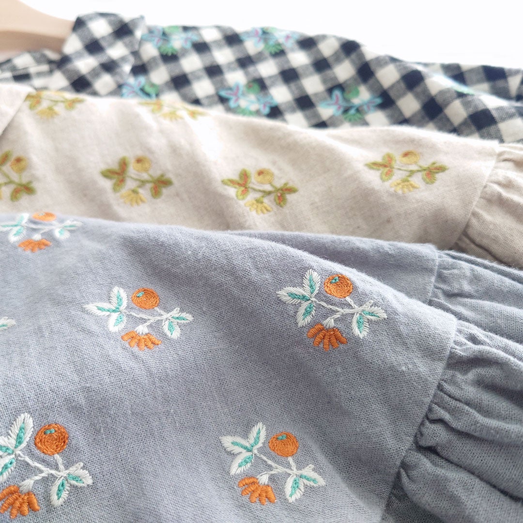 柔らかな麻綿素材を使用したワンピースは、胸元にバラの実とノースポールをリズミカルに並べて刺繍。懐かしさを感じる少しくすんだ色合いがポイントです。同刺繍はスカートもご用意いたしました。