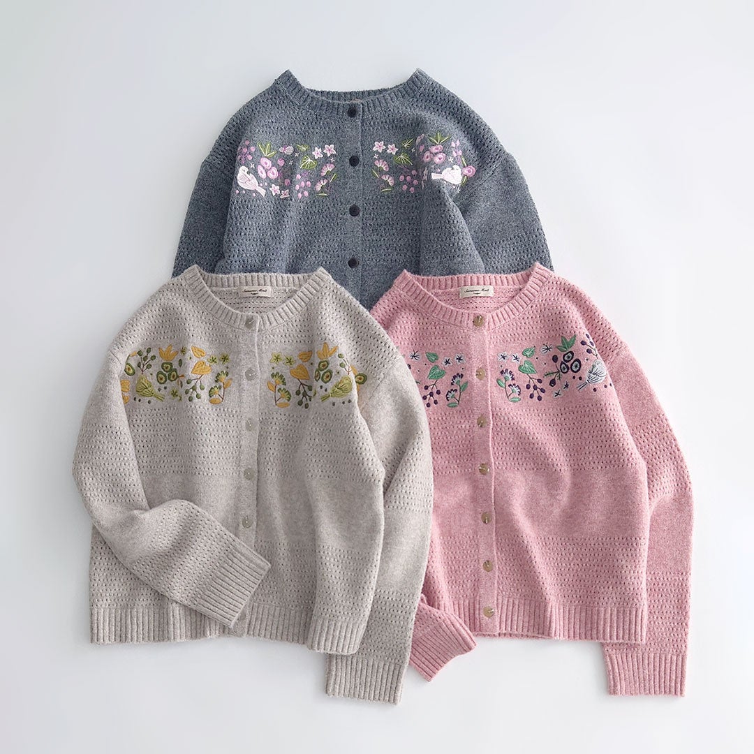 すやすやと眠る小鳥が印象的な刺繍は、ニットカーディガンとかごバッグに施しました。深い森の中を探索し、ふと現れる楽園のような景色を表現しています。
