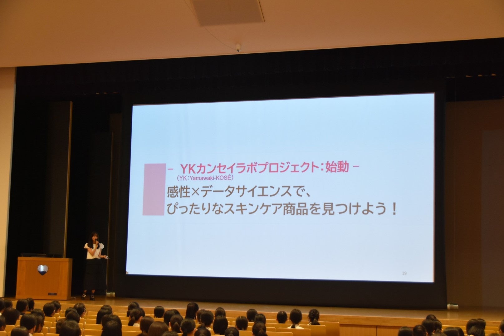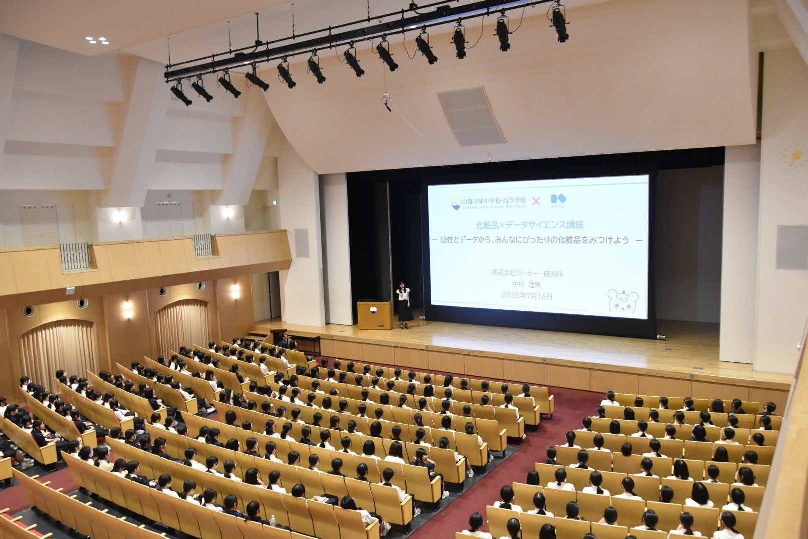 株式会社コーセー(本社:東京都中央区、代表取締役社長:小林 一俊)は、2025年7月16日に山脇学園中学校・高等学校(所在地:東京都港区)の女子中学3年生 280名に向けて、化粧品×データサイエンス講座を開催しました。講座では、当社のデータサイエンティストから化粧品開発におけるデータサイエンスの応用事例を紹介するとともに、生徒たちが取り組む研究課題「感性とデータから、みんなにぴったりの化粧品をみつけよう」を提示しました。生徒たちは今後の授業のなかで、スキンケア商品を実際に触りながら、自分たちの感性とともにデータサイエンスを学んでいきます。