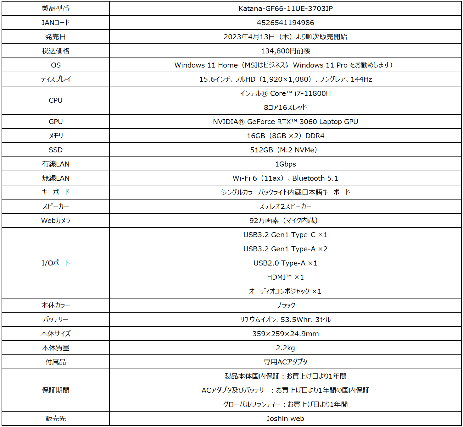 GeForce RTX™ 3060 Laptop GPU搭載ハイスペックゲーミングノートPCJoshin web限定モデル「Katana-GF66-11UE-3703JP」発売