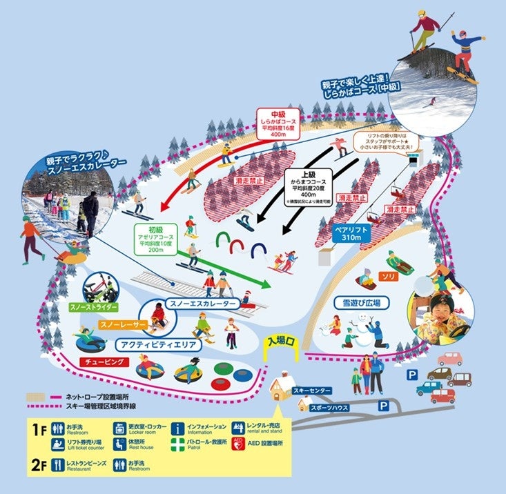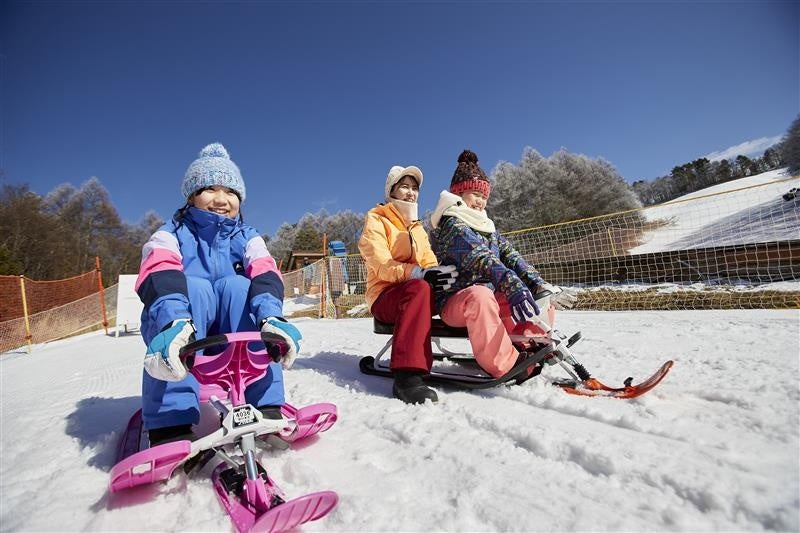 場内にはソリゲレンデやキッズ広場、スノーチュービングなども充実しており、またスキーの基礎を本格的に親子 2 名で学びたい方向けの SAJ 公認スキースクールの「スキーデビュー」プログラム(予約制)なども用意しております。
