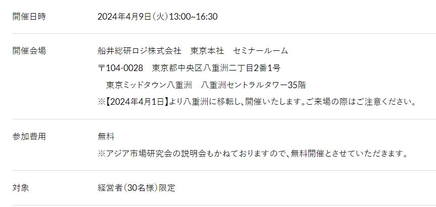 日本最大級のロジスティクス・物流コンサルティングファーム 船井総研ロジ株式会社(東京本社:東京都千代田区、代表:菅重宏、以下「船井総研ロジ」)は、2024年4月9日(火)13:00~16:30、製造業経営者の方を対象にした「アジア市場販路構築手法徹底公開フォーラム」を東京で開催いたします。