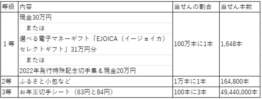 1回目の特等景品はミシンでした。発行する時代の世相を映して様々な商品が登場しましたが、2023年用の景品は下記の通りです。末等の切手シートは初回から現在まで変わりなく続いています。