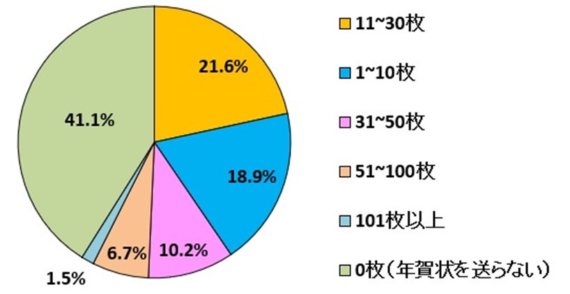 年賀状を送る枚数は上位3つの「11~30枚」(21.6%)、「1~10枚」(18.9%)、「31~50枚」(10.2%)を合わせると、50枚以下がほぼ半数を占めています。