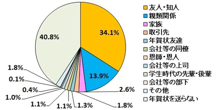 年賀状を送る相手は「友人・知人」がトップで、34.1%。2番目に多いのが「親類関係」で、13.9%。