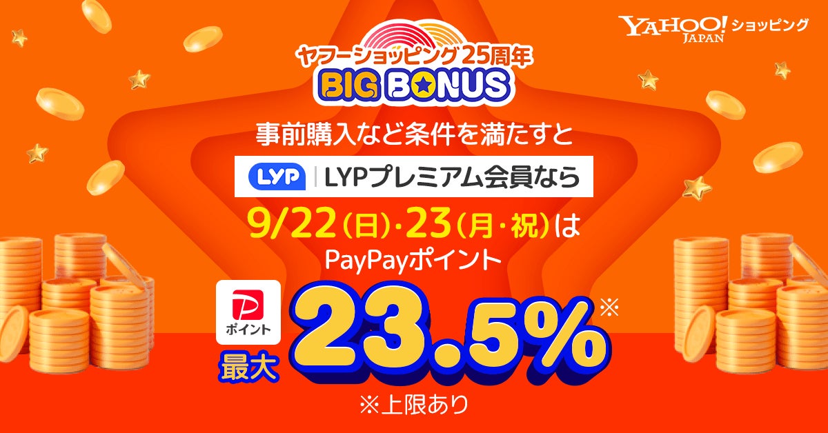 LINEヤフー株式会社(以下、LINEヤフー)が運営する毎日おトクな「Yahoo!ショッピング」は、9月1日(日)から23日(月・祝)まで「ヤフービッグボーナス」(以下、本施策)を実施します。あわせて、サービス開始25周年を記念して、「ヤフーショッピング25周年」特集を公開しました。本施策は、さまざまな企画を実施する「ヤフーショッピング25周年」と連動しており、9月22日(日)と23日(月・祝)の最終2日間(+2時間)は、事前のお買い物など条件を満たすとLYPプレミアム会員なら、最大23.5%の「PayPayポイント」が付与されます。