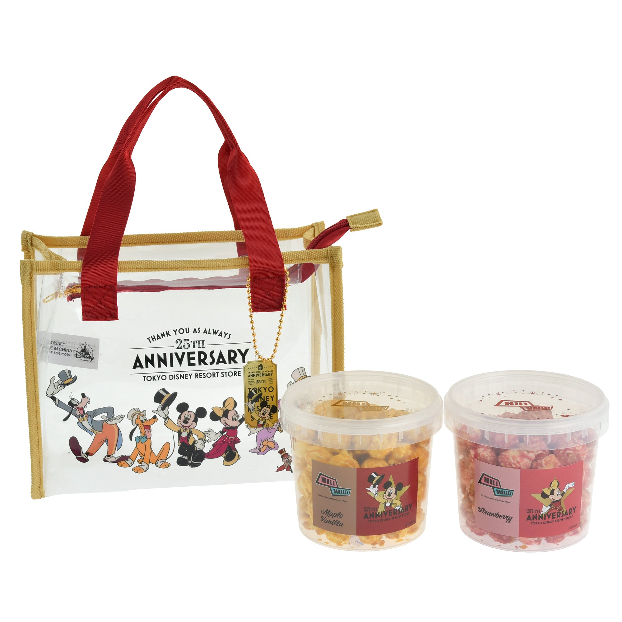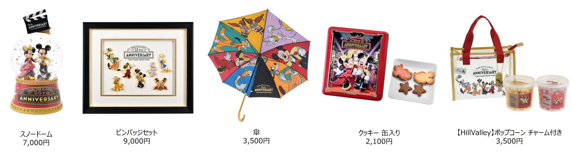 ラインナップは、ぬいぐるみをはじめ、ライフスタイル雑貨、ステーショナリー、お菓子など、バラエティ豊富に展開。キャラクターのぬいぐるみは、靴や帽子にあしらったアニバーサリーロゴが特別感を一層引き立てます。スノードームやピンバッジセットといったコレクタブルアイテムから、お土産におすすめのクッキー缶や「HillValley」のポップコーンなども登場します。25周年の東京ディズニーリゾート店でしか手に入らないスペシャルなアイテムの数々にご注目ください。