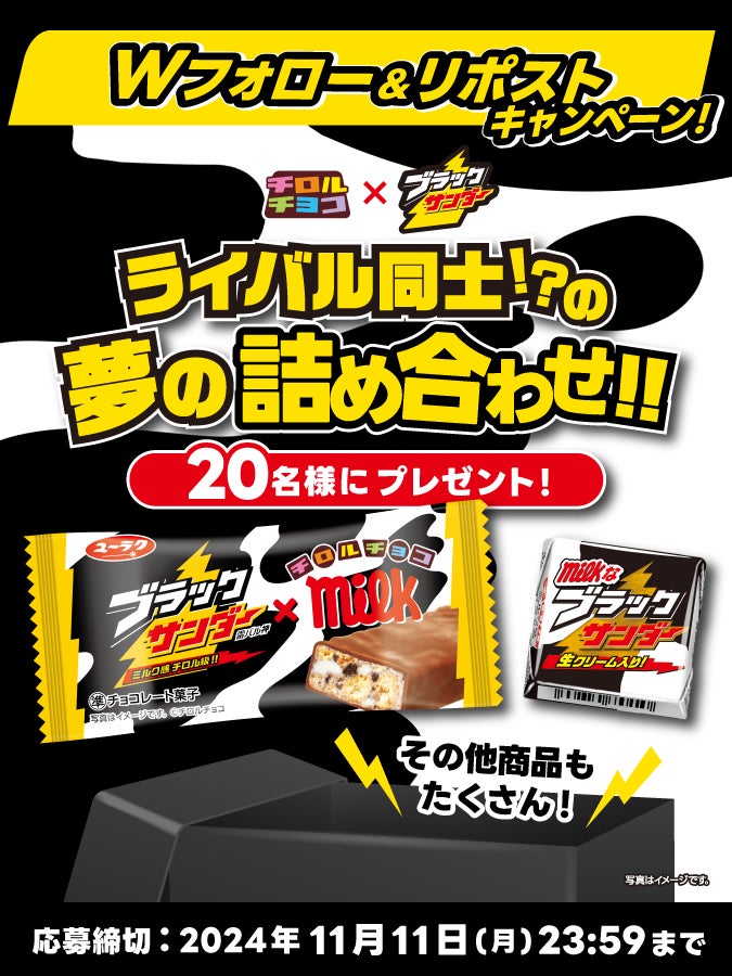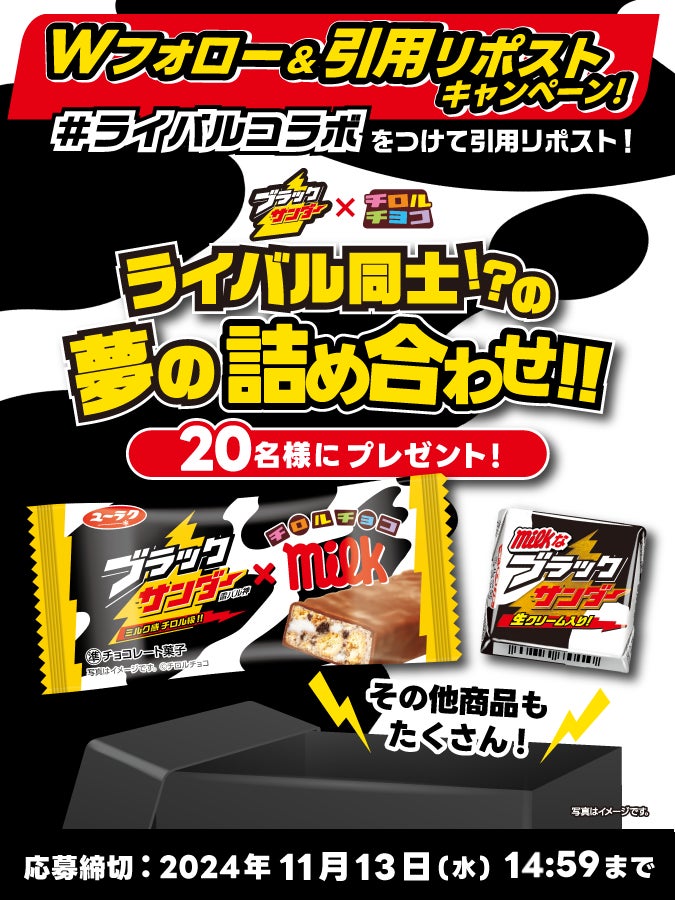 公式Xアカウント「ブラックサンダーさん【公式】(@Black_Thunder_)」と「チロルチョコ(@TIROL_jp)」をフォローの上、該当の投稿に「#ライバルコラボ」のハッシュタグをつけて引用リポストいただくと、抽選で合計20名様に豪華賞品が当たります。