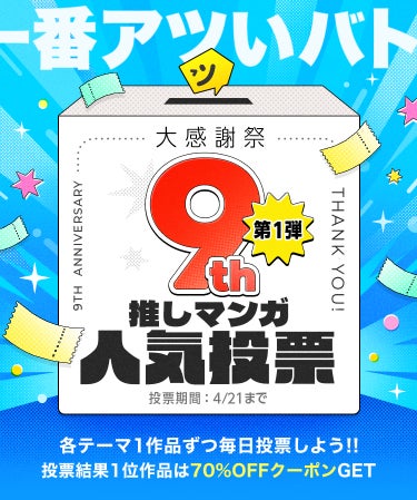 ・「推しマンガ人気投票」第1弾を4/15(火)より開始。各テーマごとに投票を開催し、ノミネート作品は「¥0+(ゼロエンプラス)(以下:¥0+)」が適用されおトクに読める!さらに1位に選ばれた作品は70%OFFクーポンを配布