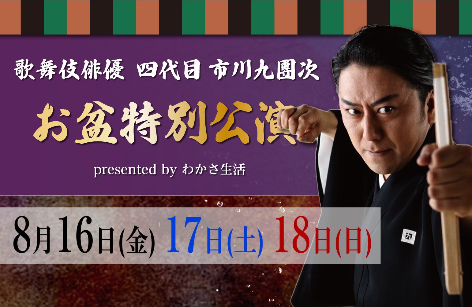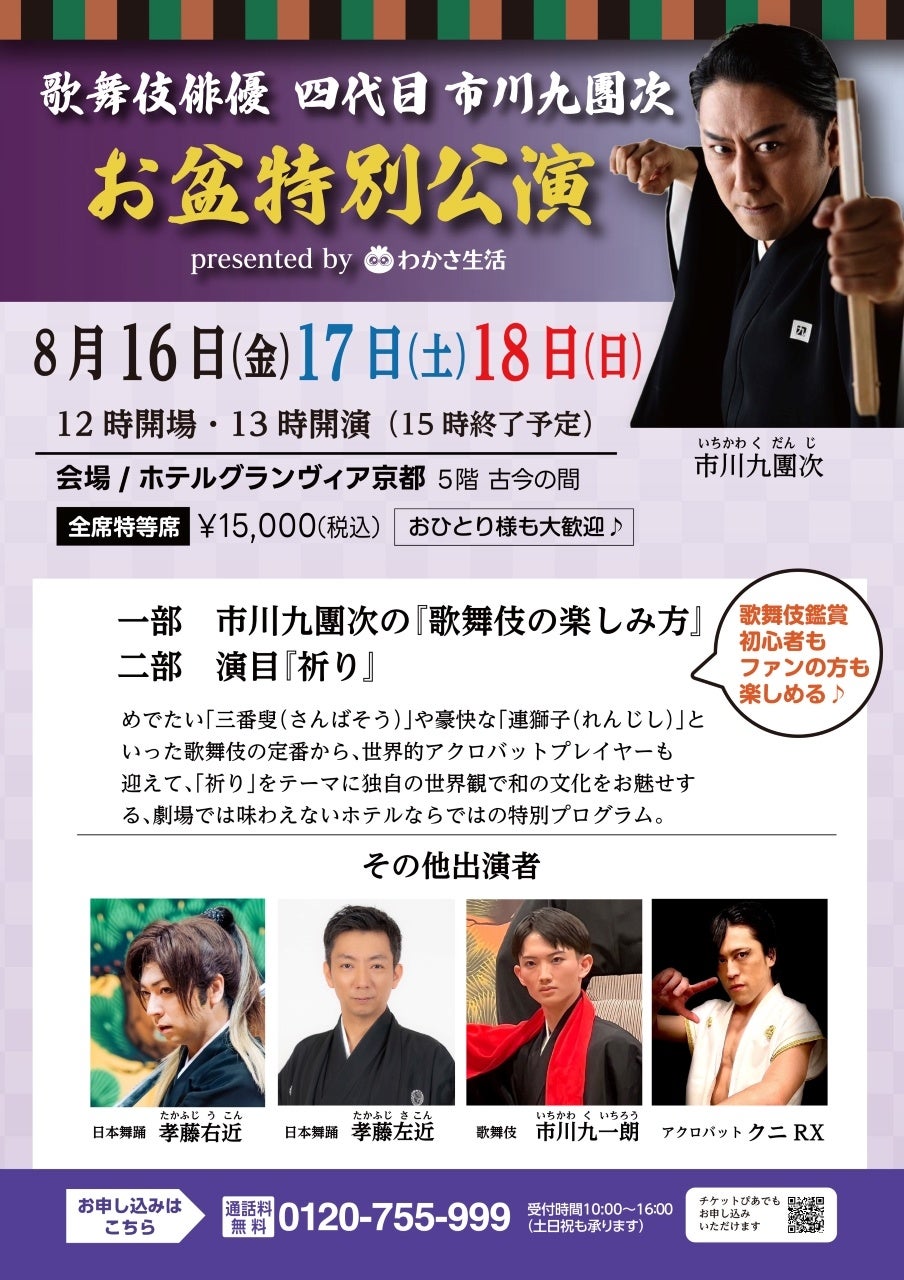 株式会社わかさ生活(本社:京都市下京区)が主催・企画をする「歌舞伎俳優四代目 市川九團次 お盆特別公演」を8月16日(金)、17日(土)、18日(日)にホテルグランヴィア京都(京都市下京区)にて開催いたします。