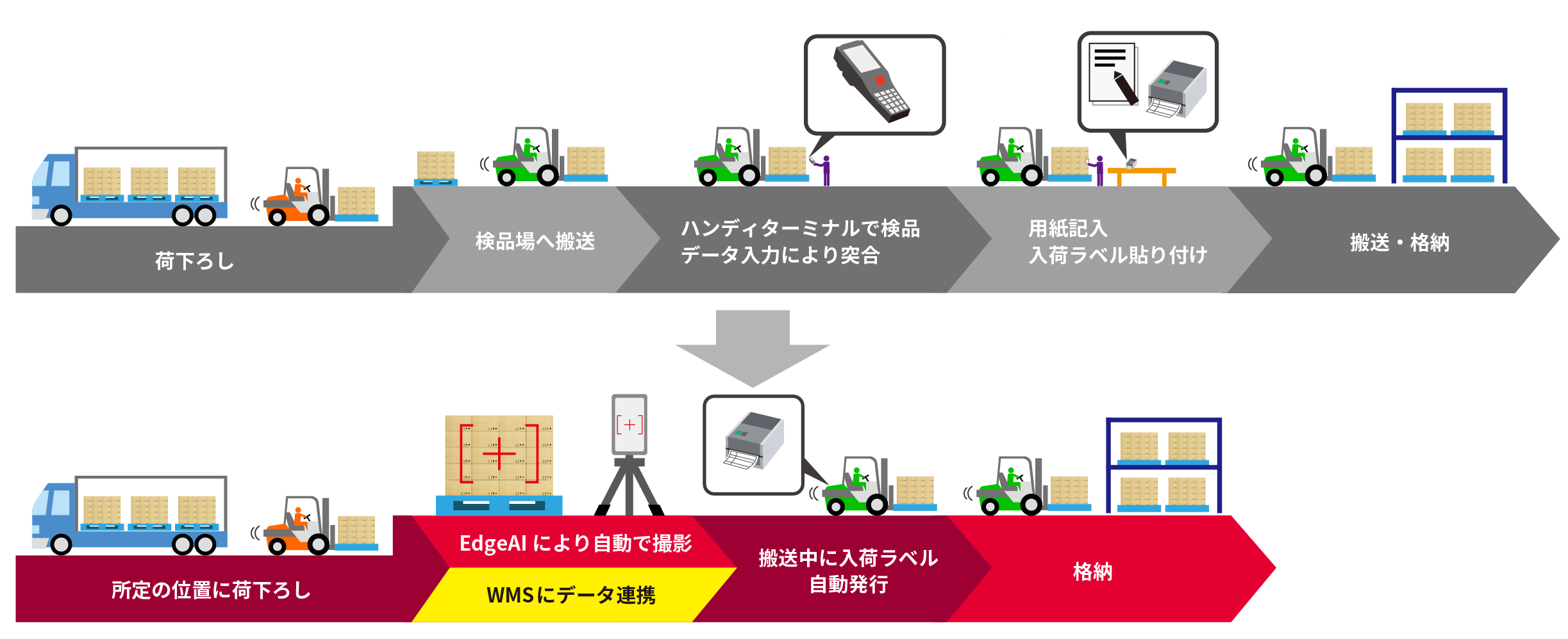 本サービスでは、指定位置に商品を荷下ろしするだけで、パレットが置かれたことをスマートフォンが自動で認識し、撮影します。AI画像認識によりパレットごと一括で商品の賞味期限や製造年月日、数量等の情報を読み取り、WMS(Warehouse Management System)にデータを連係します。WMS経由で入荷ラベルの自動発行まで行えるため、商品の荷下ろし後、庫内で搬送している間に検品が完了し、検品者の作業負荷とドライバーの荷待ち時間が大幅に削減できます。