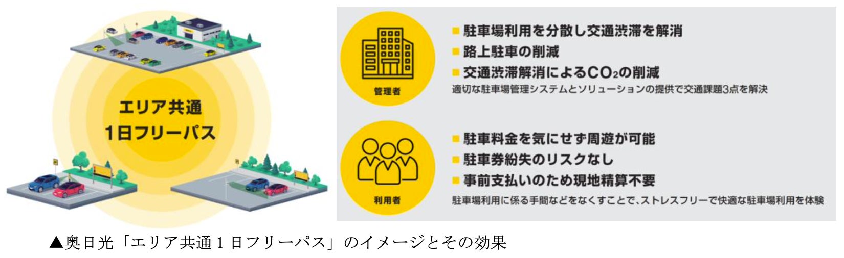 加えて、カメラ式駐車場とカメラで車両ナンバーを認識する特性を活かし、Web上で事前に利用料金の決済と車両ナンバーを登録することで、複数駐車場を自由に入出庫可能な「エリア共通1日フリーパス」を開発しました。カメラ式駐車場と「エリア共通1日フリーパス」を組合せたソリューションの提供により、観光に起因する交通渋滞が課題となっていた観光地において、1カ所に偏っていた駐車場利用を分散させ、駐車場の空き待ちによる交通渋滞の解消および周遊促進に寄与しています。