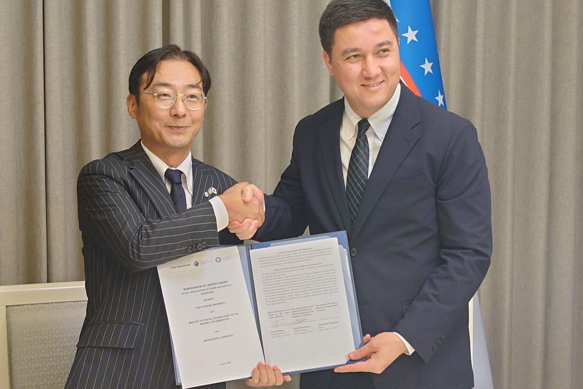 2024年8月1日、東京通信大学とJapan Digital University、ウズベキスタン共和国デジタル技術省による三者協定が締結されました。この協定では、日本におけるオンライン大学のパイオニアである東京通信大学が、ウズベキスタンのICT教育の発展のために、これまでのIT人材育成の経験を活かして協力していくことが合意されました。両国の教育協力を通じて、グローバルな人材育成も図ります。