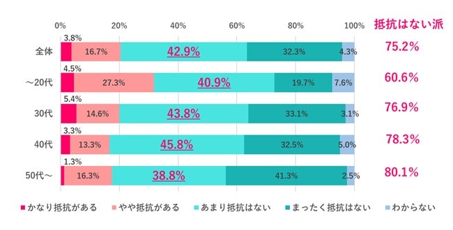 年代別で比較すると、若年層の方が抵抗を感じる割合が高く、年代が上がるにつれ「抵抗はない派」の割合が増加する傾向がありました。社会人経験が長くなると上司が年下のケースも増えていくので、抵抗がなくなると予想されます。