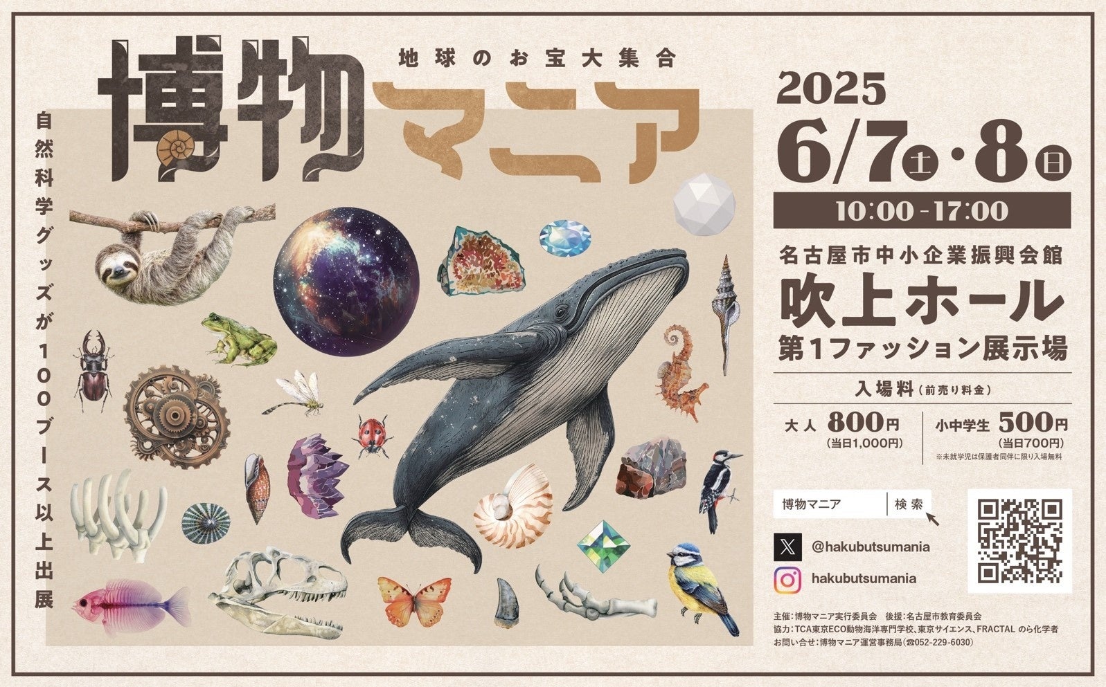 博物マニア実行委員会(テレビ愛知、ぴあで構成)は2025年6月7日(土)、8日(日)に、自然科学をテーマにしたイベント『地球のお宝大集合!博物マニア』を、名古屋中小企業振興会館 吹上ホール(2階) 第1ファッション展示場で開催いたします。会場ステージでは、TikTokで60万人以上のフォロワーを抱える化学系インフルエンサー「のら化学者」をはじめとした、自然科学のエキスパートたちが出演します。