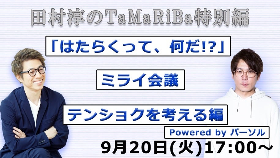 総合人材サービスのパーソルホールディングス株式会社(本社:東京都港区、代表取締役社長 CEO:和田 孝雄)は、株式会社テレビ東京(本社:東京都港区、代表取締役社長:石川 一郎、以下テレビ東京)と、「田村淳のTaMaRiBa特別編「はたらくって、何だ!? ミライ会議 テンショクを考える編 Powered by パーソル」を9月20日(火)17:00~18:30(予定)で開催し、その模様を無料ライブ配信します。「自分自身のはたらくを考え、そして前向きにとらえる"きっかけ"を作りたい」という想いのもと、同番組が、それぞれの「はたらく」を考えるきっかけとなり、明日からのはたらき方や生き方にポジティブな影響を与えることを目指します。