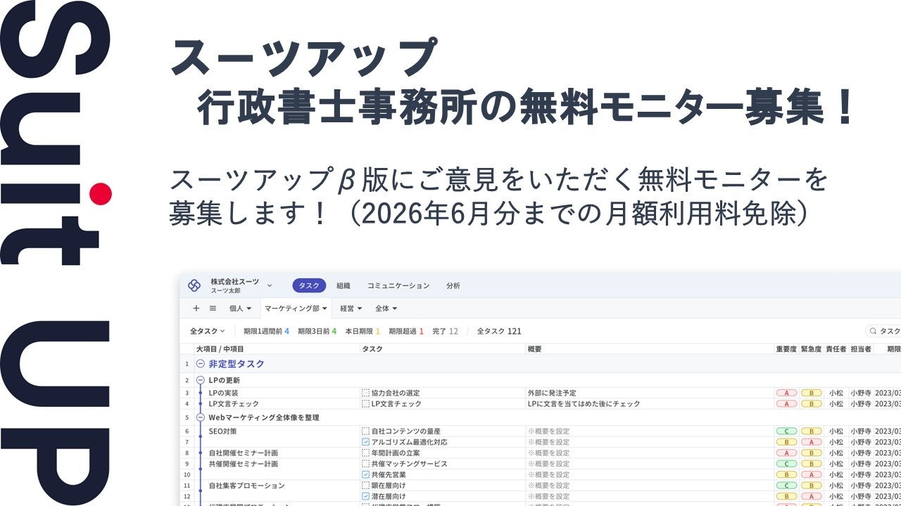株式会社スーツ(所在地:東京都千代田区、代表取締役社長CEO:小松 裕介)は、AIでかんたん、チームのタスク管理・プロジェクト管理ツール「スーツアップ」において、行政書士事務所の無料モニターを募集いたします。