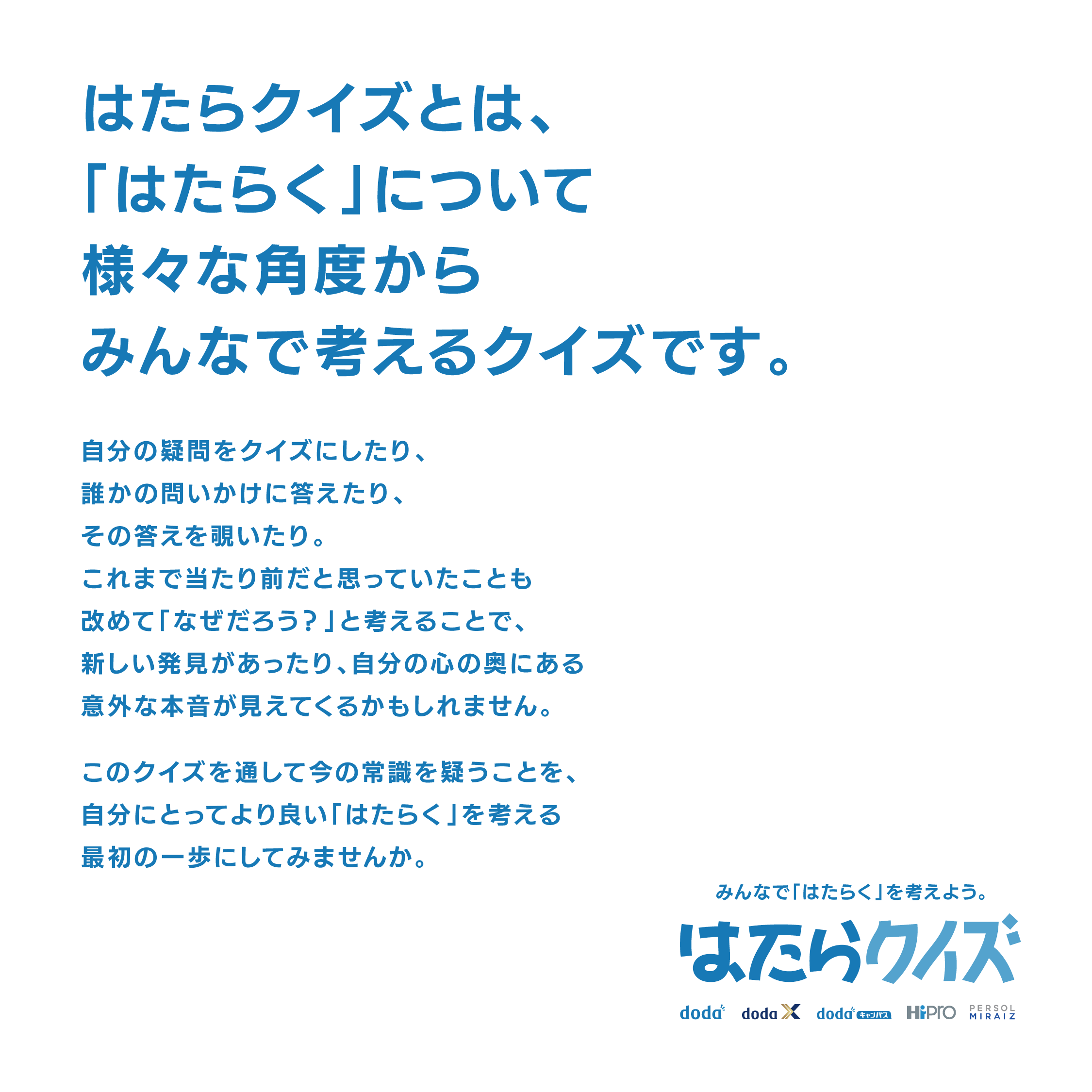 当社では、ミッションに「人々に『はたらく』を自分のものにする力を」を掲げ、キャリアオーナーシップを育む社会の創造を目指しています。ミッションを遂行するにあたり、2024年4月1日に、2026年までの中期経営指針を策定するとともに、その実現に向けた具体的なアクションとして、 “あなただけの「はたらく」を一緒につくろう。”プロジェクト(略称:はたつくプロジェクト)を発足。そして今回、“はたつくプロジェクト”の第一弾として、多くの人に「はたらく」について考えてもらい、その中で、自分にとってより良い「はたらく」とは何かを見つけてもらいたい、という想いから、「はたらクイズ」を実施する運びとなりました。