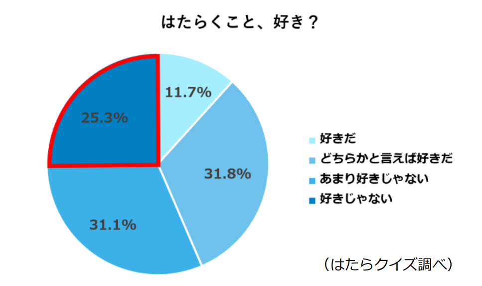 「はたらくことが好きか」をきいたところ「好き/どちらかというと好き」と「あまり好きじゃない/好きでない」と答えた人の割合はほぼ同数となりました。一方で、明確に「好きではない」(25.3%)と回答した人の割合は「好き」(11.7%)の約2倍となり、“はたらく”についてポジティブに捉えている人が少ない現状が分かりました。また、「仕事の優先度」を質問すると「1位」と答えた人は13.2%となりました。