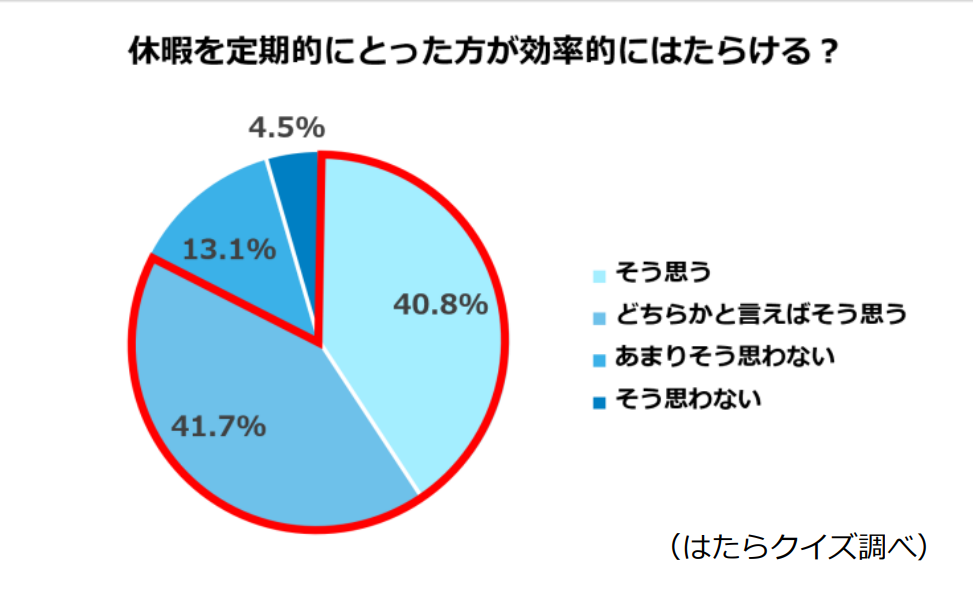 【調査結果サマリー】 ・はたらくことが「好きではない」(23.5%)と回答した人は「好き」(11.7%)の約2倍という結果に ・休暇を定期的にとった方が「効率的にはたらくことができる」と考えている人は82.5%※ |