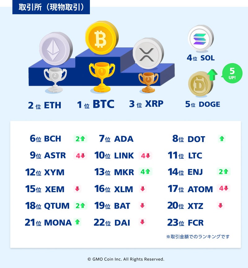 「取引所(現物取引)」では、「販売所」と同様にドージコイン(DOGE)とビットコインキャッシュ(BCH)が順位を上げました。そのほか上位銘柄に大きな変動はありませんでした。