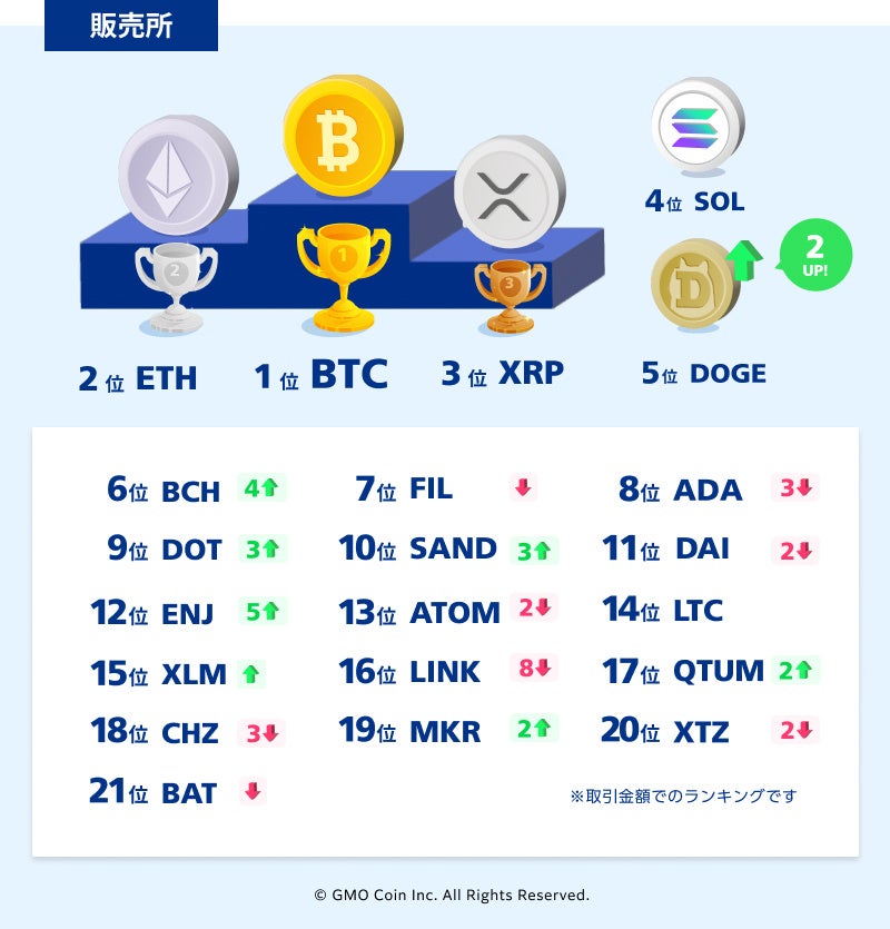 「販売所」では、上位4銘柄に変動はないものの、価格が大きく上昇したドージコイン(DOGE)とビットコインキャッシュ(BCH)が順位を上げそれぞれ5位と6位にランクインしました。