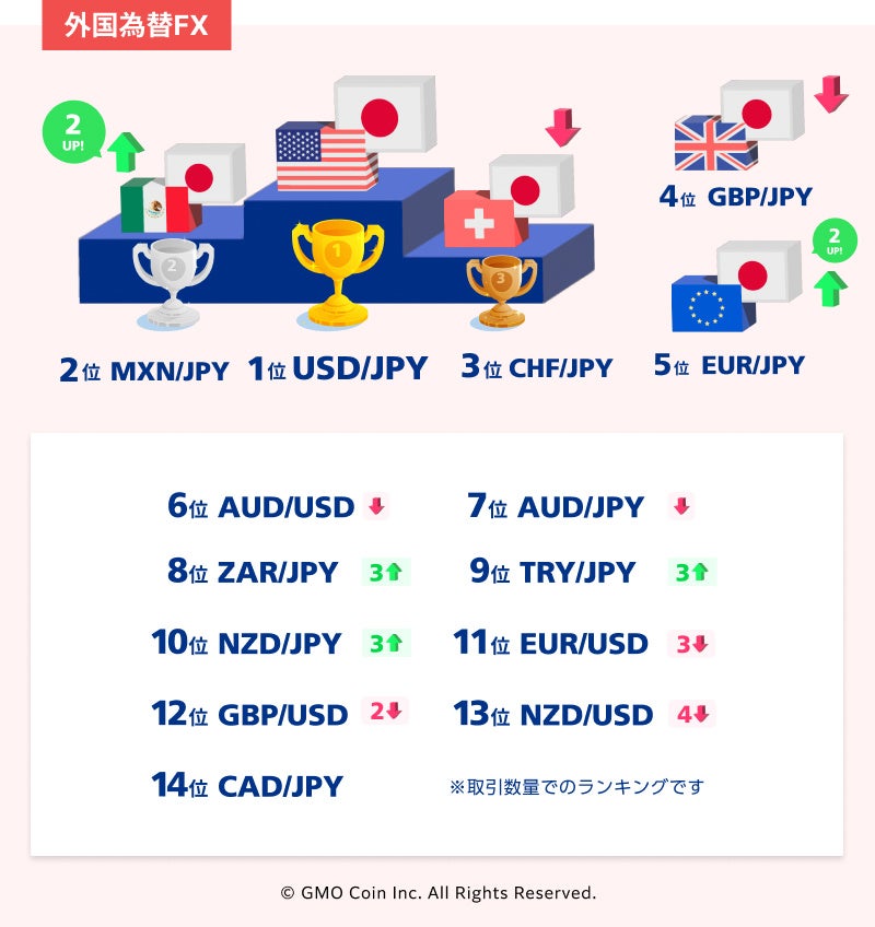 「外国為替FX」では、USD/JPY(米ドル/円)が引き続き1位となりました。MXN/JPY(メキシコペソ/円)、EUR/JPY(ユーロ/円)が先月から取引を伸ばし、それぞれ2位と5位にランクインしました。