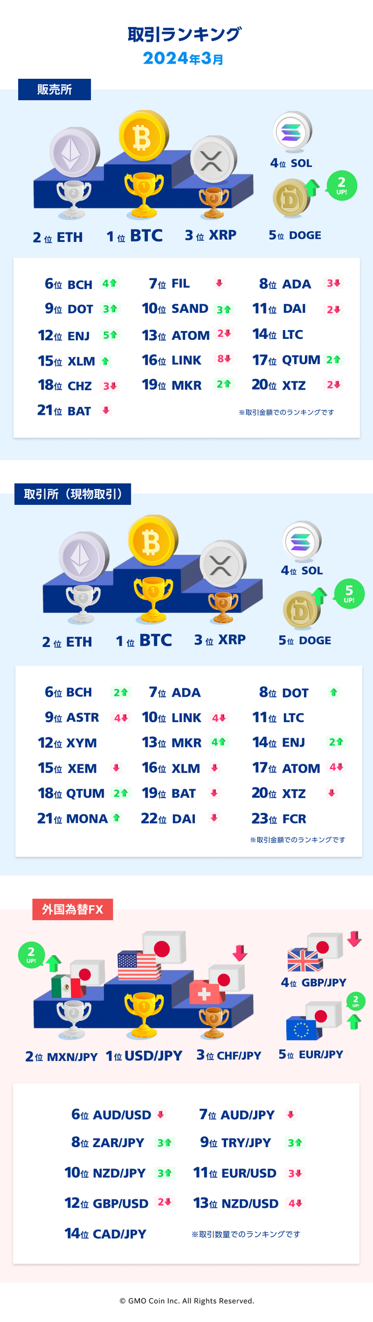 GMOコインの以下サービスにおける2024年3月の取引ランキングをご紹介します。