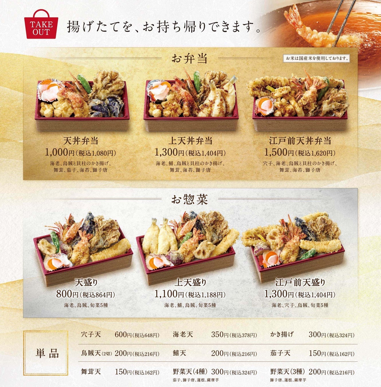 「大牡蠣天丼」は、店内飲食はもちろんお弁当としてテイクアウトも可能です。