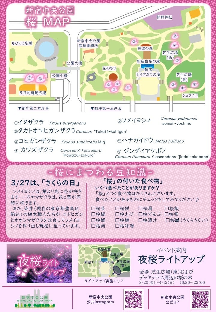 新宿中央公園でみられる桜の仲間や桜に似た春の植物を掲載したリーフレットを3月下旬から配布中です。植物についての情報、園内散策を楽しめる桜MAP・桜にまつわる豆知識を掲載しています。園内の各チラシラックに設置しています。是非手に取って園内散策をお楽しみください。