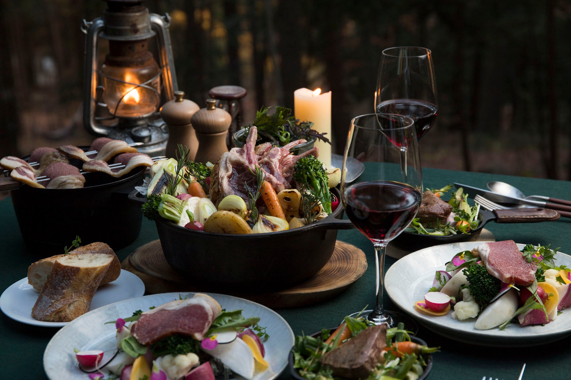 狩猟体験後の夕食は、鹿肉や猪肉を使った「ジビエディナー」です。星のや富士で通年提供しているこのディナーは、屋外の会場で富士山麓周辺で獲れたジビエを味わうコース料理です。アウトドアに精通したグランピングマスターと共に、アウトドア器具を使って仕上げる体験も行います。自然の中で生活しているシカやイノシシは、季節毎に食べているものが異なり、それによって肉の味わいも変化します。特に秋はどんぐりや木の実を食べるため、脂を蓄え、1年の中でも美味しいジビエが楽しめる時期です。秋の「ジビエディナー」では、猟師が森に出る時に狩猟をしながら、茸を採取して帰るというライフスタイルになぞらえ、ジビエと茸を合わせた極上の料理を提供します。動物の命をいただき、食材として美味しく消費するまでの流れを体験することで、命を無駄なくいただくことの大切さについて考えを深めます。