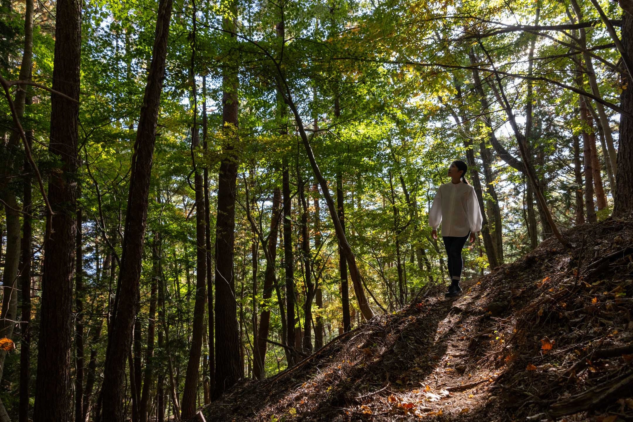 狩猟体験に向かう前日には、星のや富士の豊かな自然の中を、グランピングマスターとともに歩く時間を過ごします。星のや富士は、約6haの敷地内に森を縫うように設計されており、自然との距離がとても近く、まさに人間と自然が共存するリゾートです。敷地内の森を歩くと、夜の人間がいない間にシカやイノシシが歩いてできた獣道や、時折、シカが木の皮を食べた跡、イノシシが餌を探した痕跡などを見つけることができます。「自然に触れる森歩き」は、都会にいると感じづらい動物たちの息遣いに触れ、人間と動物が切り離された空間にいるのではなく、同じ空間で共存していることを肌で感じる時間です。グランピングマスターから森や動植物の話を聞きながら散策した後は、自然に囲まれた特別席で焚き火を囲みながら過ごし、プログラムを通して感じたことを消化します。自分自身が自然のサイクルの中にいる実感を持ち、翌日の狩猟体験を迎えます。