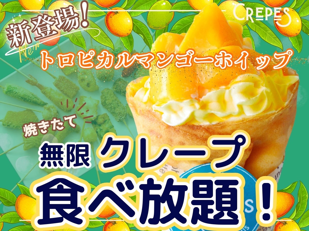 【夏を感じるクレープを無限に満喫‼】横浜ワールドポーターズで楽しもう!『串揚げ・串天ブッフェ くし葉』にてセルフメイクスイーツのクレープコーナーに『トロピカルマンゴーホイップ』が期間限定にて新登場!