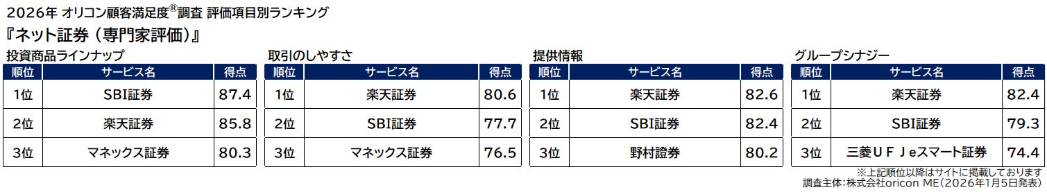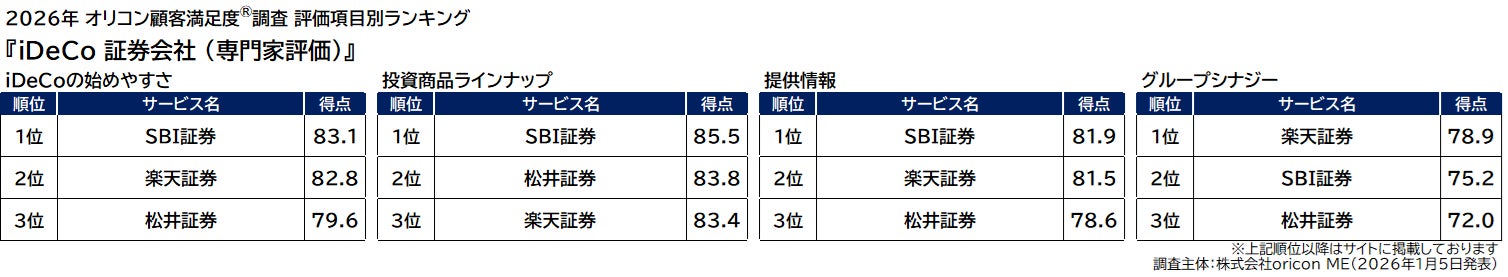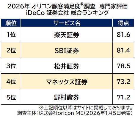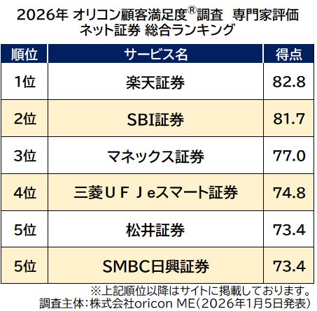 オリコン株式会社(本社:東京都港区 代表取締役社長:小池 恒 略称:オリコン)は、グループ会社である株式会社oricon MEが、金融系の専門家※を対象に実施した『ネット証券』『iDeCo(証券会社/銀行)』『FX』のランキング結果を、2026年1月5日(月)14時に発表いたしました。結果は、下記の通りとなりました。
