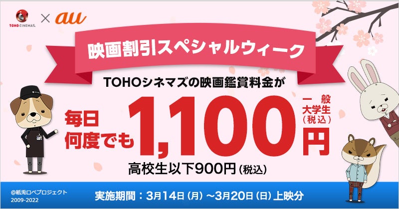 au以外の方も使える!KDDI×TOHOシネマズ 恒例の特別なキャンペーン「映画割引スペシャルウィーク」 3月14日からの1週間、映画が毎日1,100円