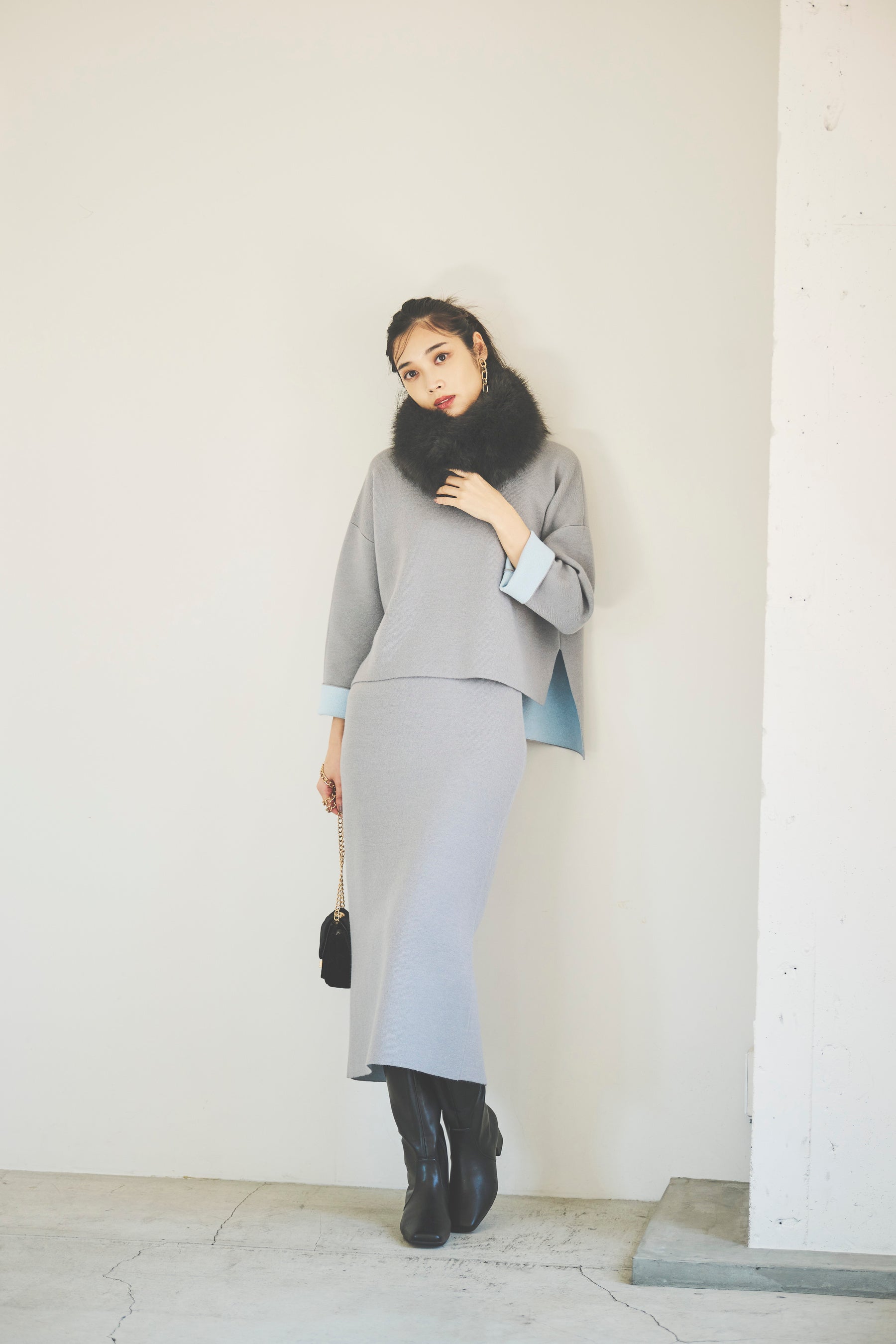 1着で何通りものアレンジが楽しめる、リバーシブルのハイネックニットとタイトスカートです。
