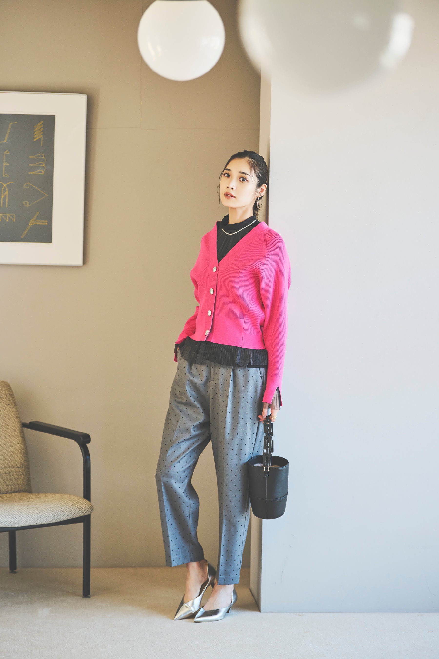 今年らしいボリューム袖のVネックニットカーディガンは、レイヤードスタイルが楽しめるよう、短めの着丈がポイントです。鮮やかなピンクに、トレンドカラーのグレー、万能に使えるブラックとオフホワイトの4色をラインアップ。アクセントにメタリックカラーの変形ボタンを配しました。