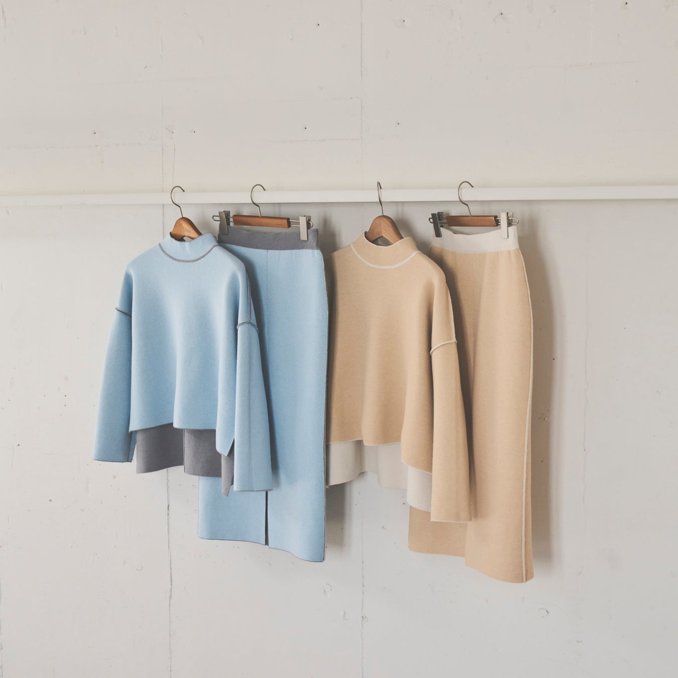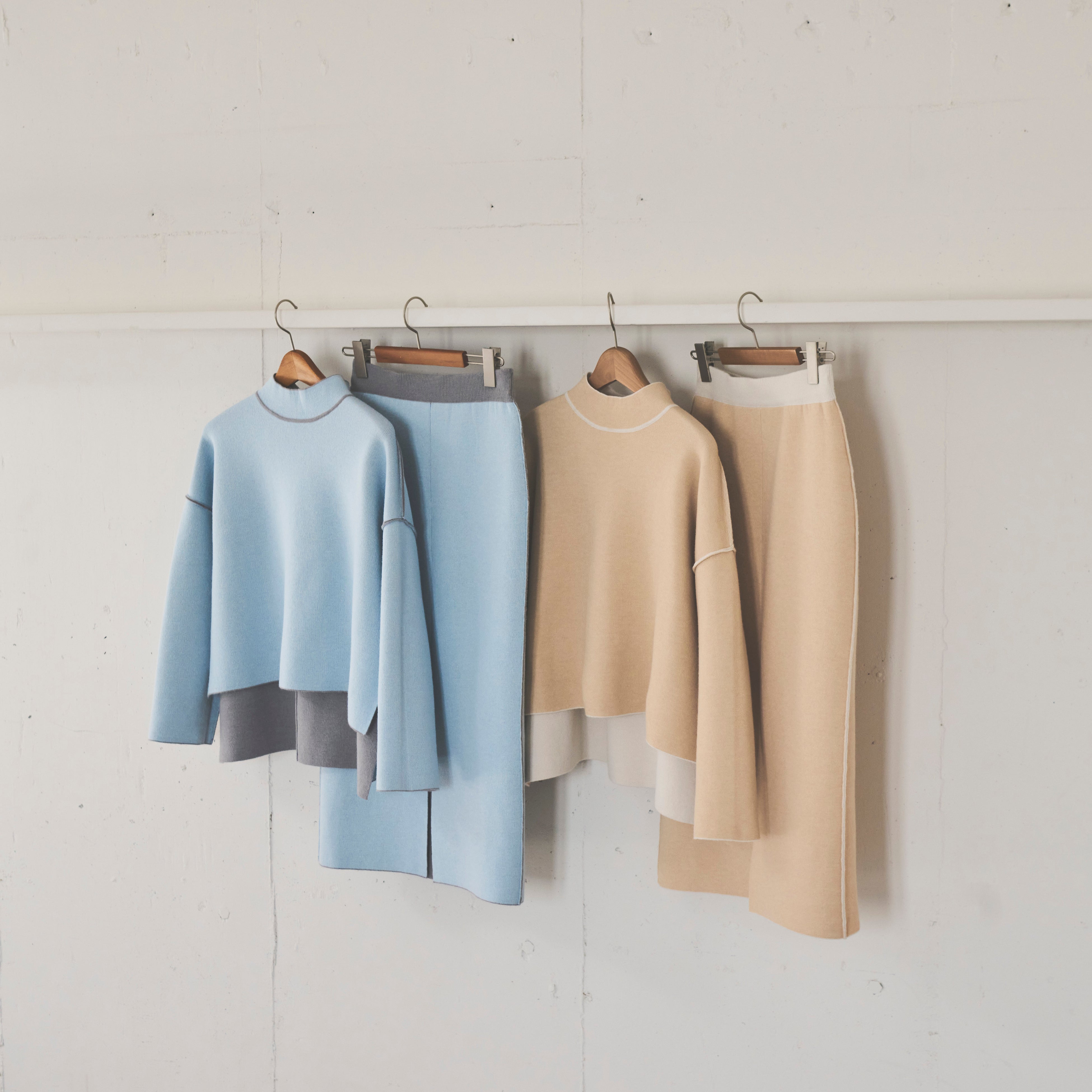 リバーシブル仕様のニットプルオーバーとタイトスカートは、両面とも肌なじみの良いニュアンスカラーの配色でご用意いたしました。単品使いはもちろん、上下で色を変えたりと、この1セットで冬のオシャレの幅がぐっと広がるアイテムです。
