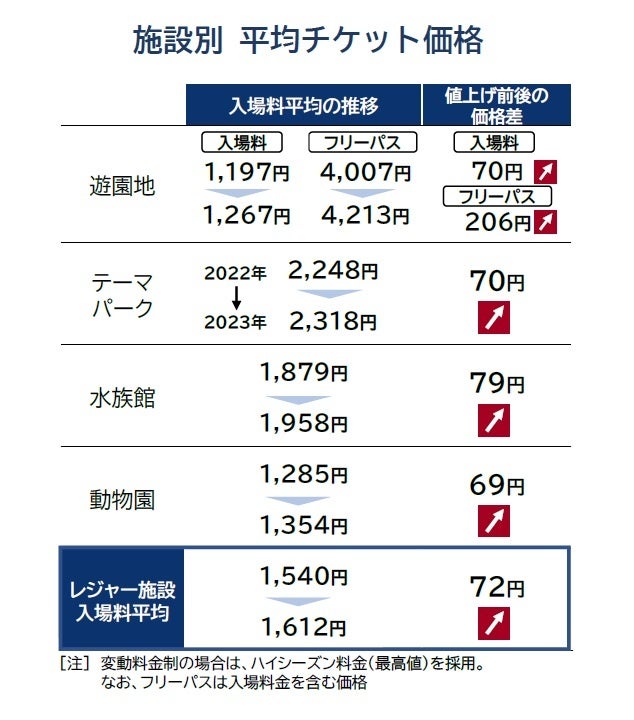 価格改定前後のチケット料金をみると、2023年におけるレジャー施設全体の平均価格(入場料)は1612円だった。22年(1540円)に比べ4.7%(72円)上昇した。施設別ではチケット価格帯や値上げ幅に差があり、特に遊園地の「フリーパス」平均価格は4213円と4000円を超えたほか、22年平均からの上昇幅も206円(+5.1%)と、他施設に比べて大幅な価格アップとなった。最繁忙期・閑散期間で1000円以上の幅がある料金体系など「変動価格制」を導入する動きが大手を中心に進み、終日滞在が可能なフリーパスチケットを中心に高額化が進んでいる。また、「水族館」では、チケット平均価格が22年比79円上昇の1958円となり2000円台に迫る。