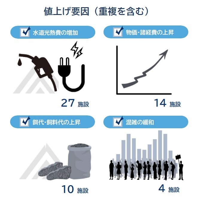 レジャー施設で相次ぐ値上げの背景には、特に電気代などエネルギー価格の増加が大きな影響を及ぼしている。2023年に値上げする61施設のうち、価格改定の理由が判明した39施設の要因をみると、最も多かったのは「光熱費の上昇」で27施設に上り、値上げ理由の7割を占めた。遊園地では遊具の稼働に、水族館や動物園では飼育のためのポンプや空調機器の稼働で電気を消費するため電気代が22年から大幅に増加し、運営面でのダメージが大きかったほか、電気代の節減も難しいことから、値上げに踏み切らざるを得なかった施設が多くみられた。そのほか、「物価・諸経費の上昇」(14施設)や「餌代・飼料代の高騰」(10施設)なども多いほか、繁忙期と閑散期で入園者の数を平準化する「混雑の緩和」目的の値上げも大手を中心に4施設判明した。
