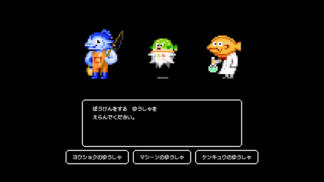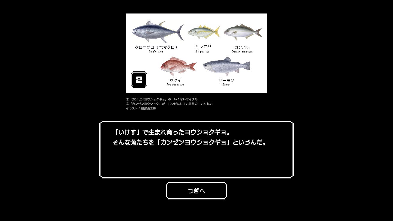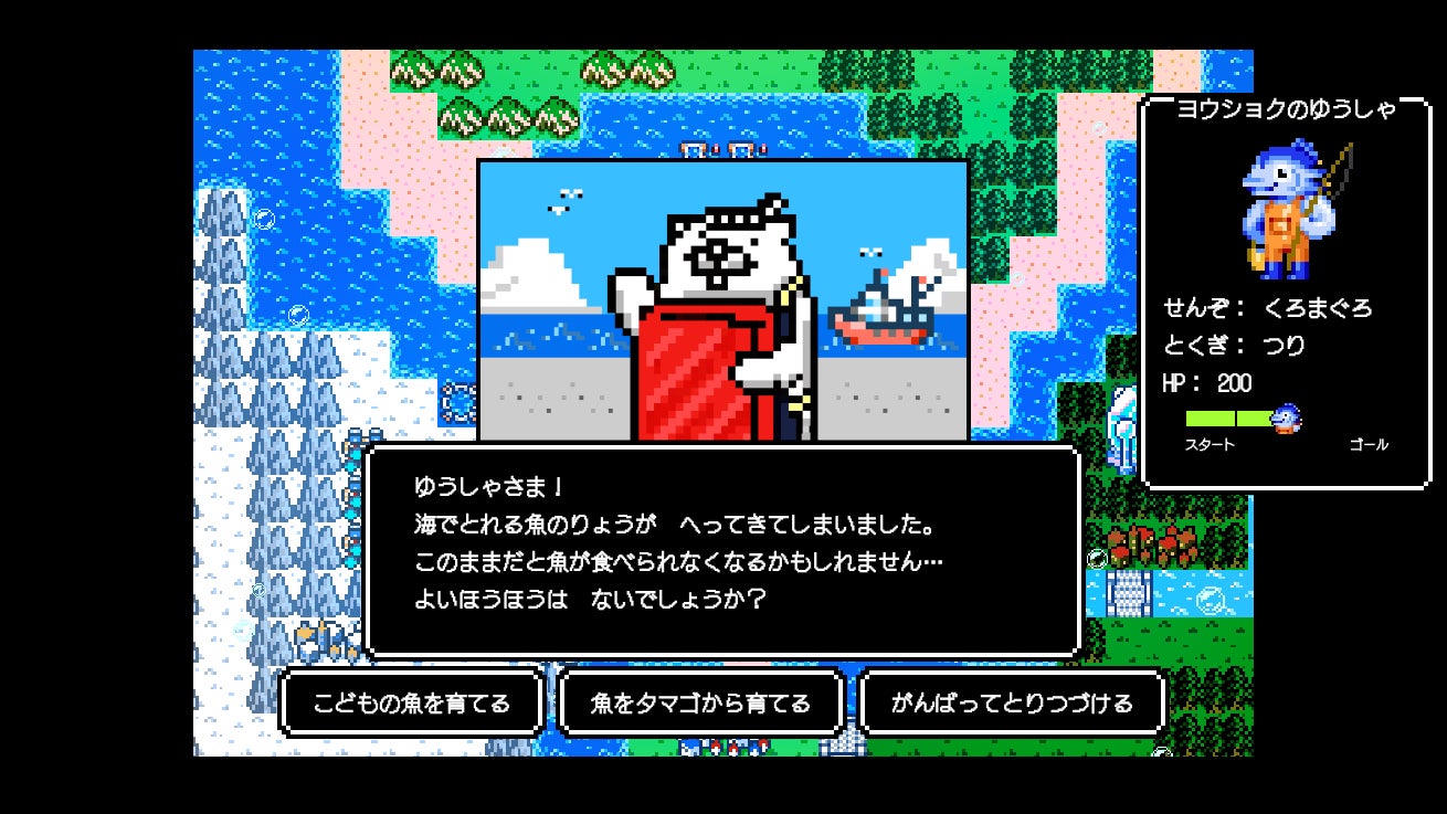本ゲームは、プレイヤーが「養殖」「機械」「研究」3つの国のいずれかの勇者となり、水産業が直面する課題をクイズ形式で解決していくロールプレイング風の世界観をもつゲームです。