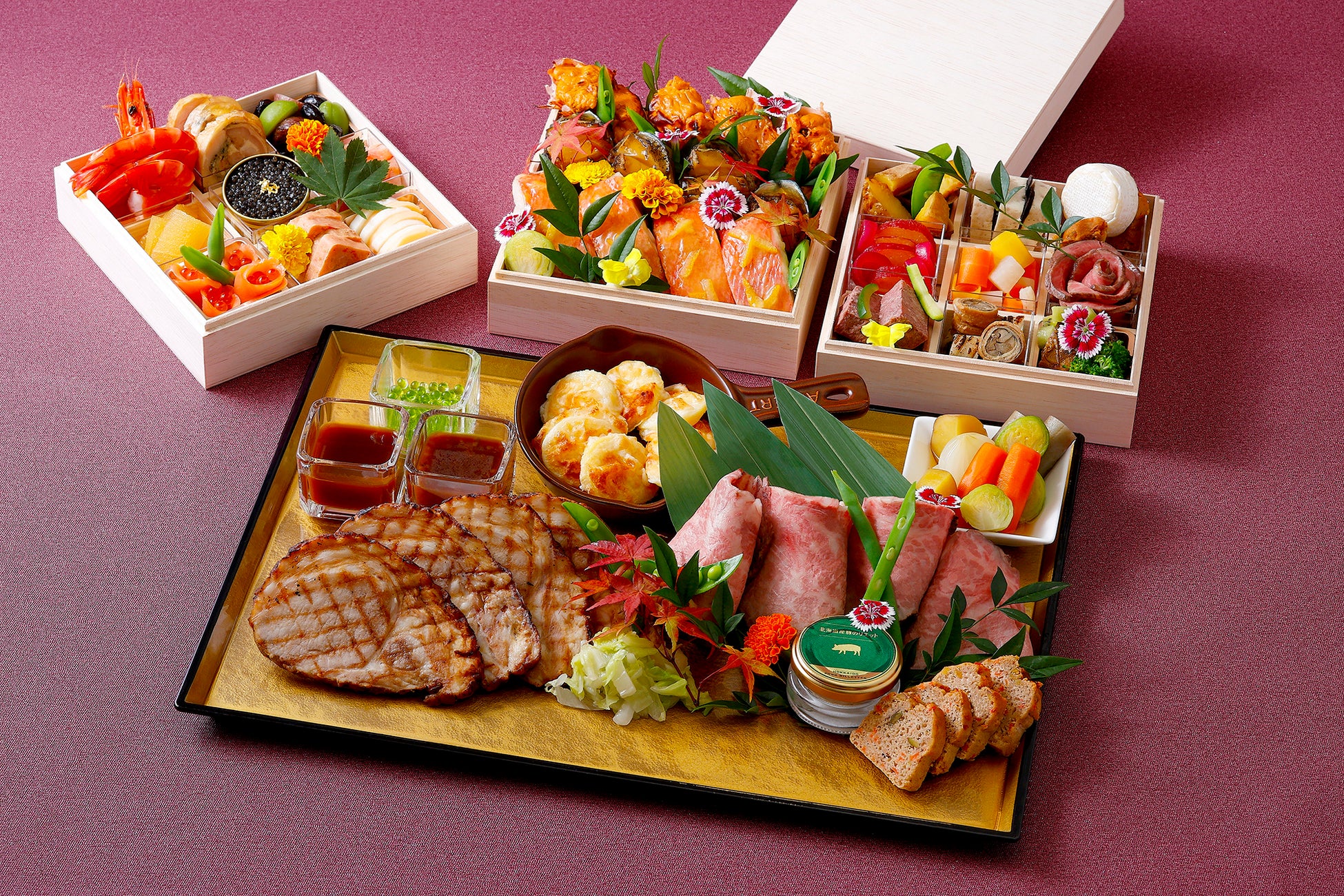 贅沢食材をふんだんに使用した特選四段重(寿)は、壱の重と弐の重で“和”の伝統料理や縁起物を洋風にアレンジした和と洋の調和をご堪能いただけます。参の重ではオマール海老や金目鯛、鮑が目にも美しく、肆の重では千葉県産しあわせ絆牛のF1ローストビーフや松坂ポークのローストがラインナップし、ボリューム満点の四段重に仕上げました。