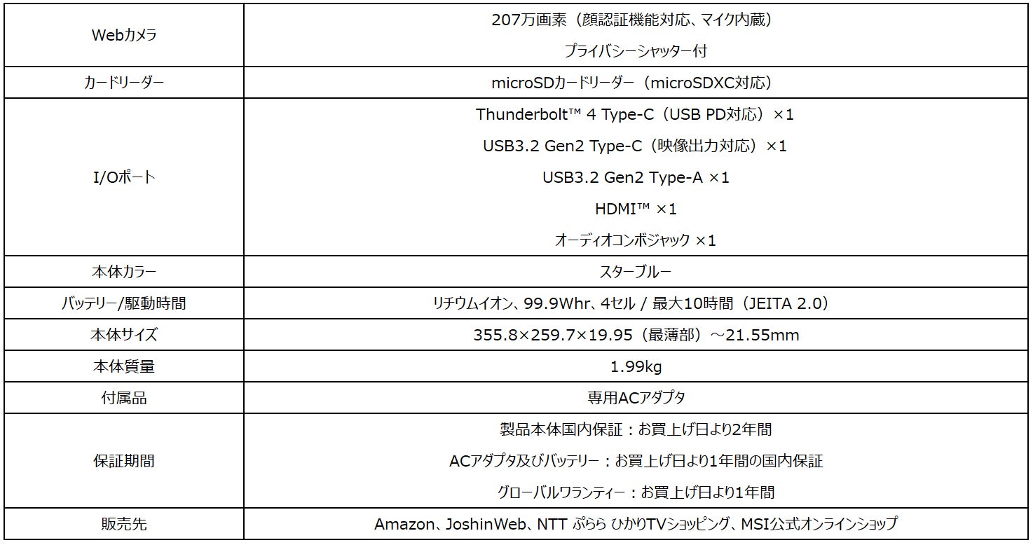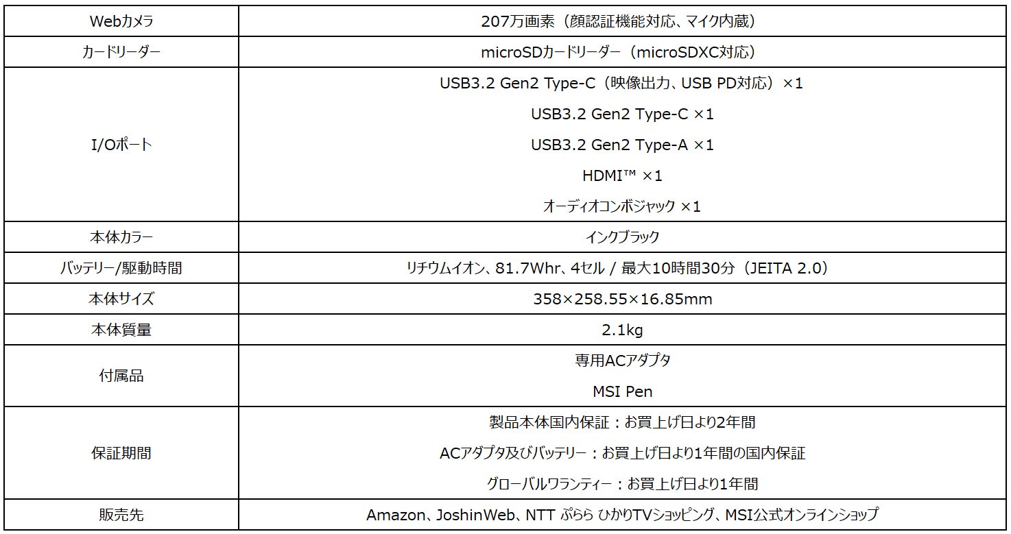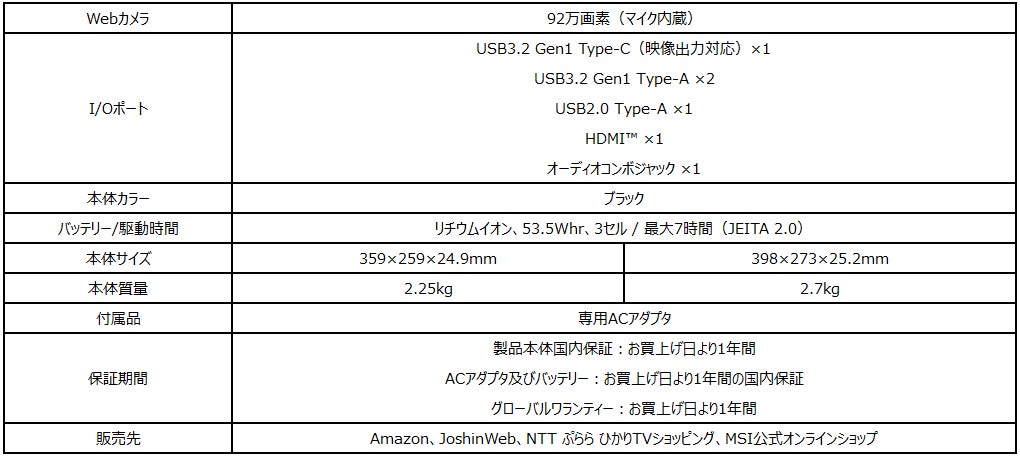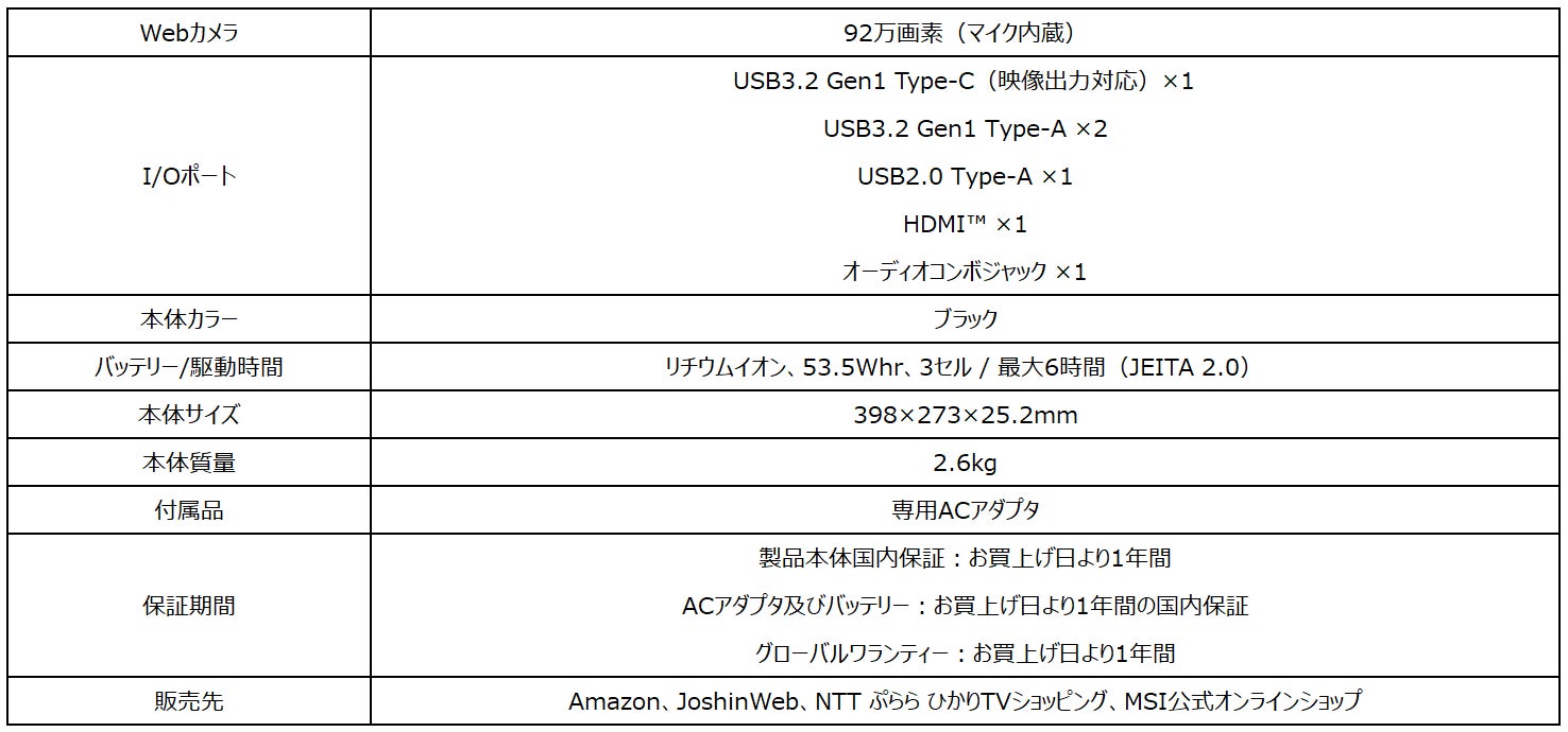 この他、16インチの大画面タイプで薄さ19.95mm(最薄部)・軽さ1.99kgを実現した薄型・軽量ハイエンドゲーミングノートPC「Stealth-16Studio-A13VG-1403JP」を2023年4月12日(水)より、ハイエンドクリエイターノートPC「Creator Z17 HX Studio A13V」シリーズ、360度フリップディスプレイと専用GPUを搭載したビジネス・クリエイターノートPC「Summit-E16Flip-A13VFT-2103JP」を2023年4月13日(木)より、MSIのゲーミングノートPCとして初の「Ryzen™ プロセッサー」+「GeForce RTX™」を実現した「Bravo-15-C7VE-3403JP」「Bravo-17-C7VF-3303JP」を2023年4月18日(火)よりオンラインストアで発売いたします。また、ベーシックタイプの14インチビジネスノートPC「Modern-14-C11M-1402JP」を2023年4月14日(金)よりAmazon限定で販売いたします。