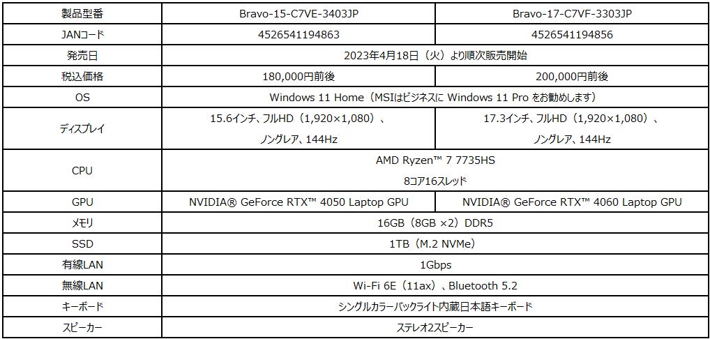 「Bravo-15-C7VE-3403JP」はコンパクトな15.6インチタイプ、「Bravo-17-C7VF-3303JP」は17.3インチの大画面ディスプレイ搭載モデルとなっています。