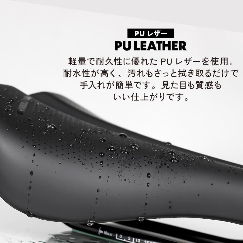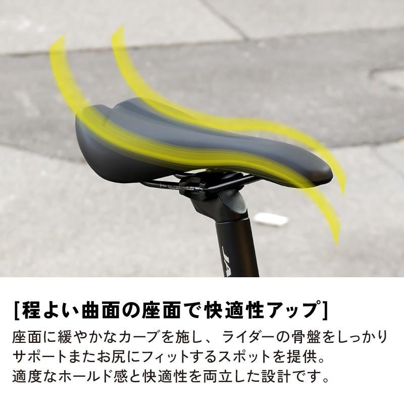 このサドルは標準的な長さ270mmで、前傾姿勢に適したカーブした座面が体にフィットし、