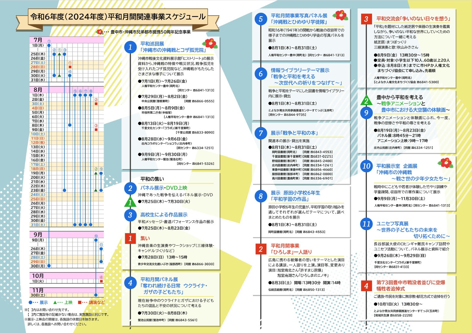 豊中市は、毎年8月を平和月間と定め、市民の皆さんに核兵器の廃絶や平和について考えていただく機会を設けています。今年は、集いや講談、児童の作品展示などのほか、11月に沖縄市との兄弟都市提携50周年を迎えることから、沖縄戦に関する写真パネル展も開きます。